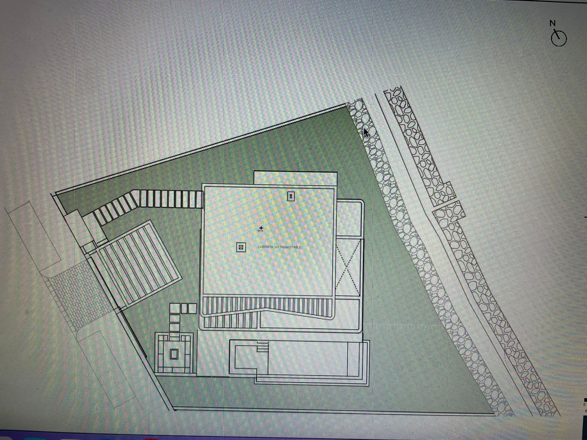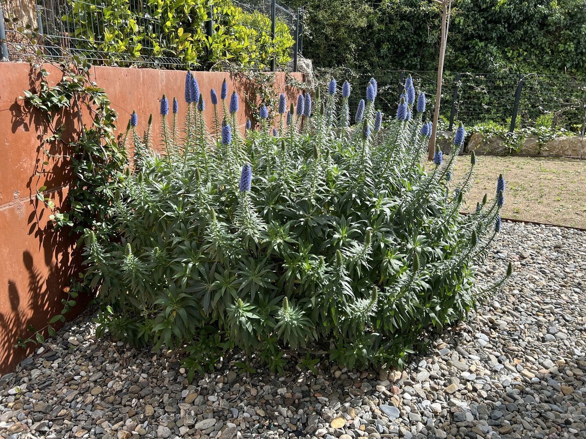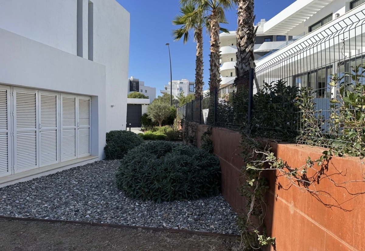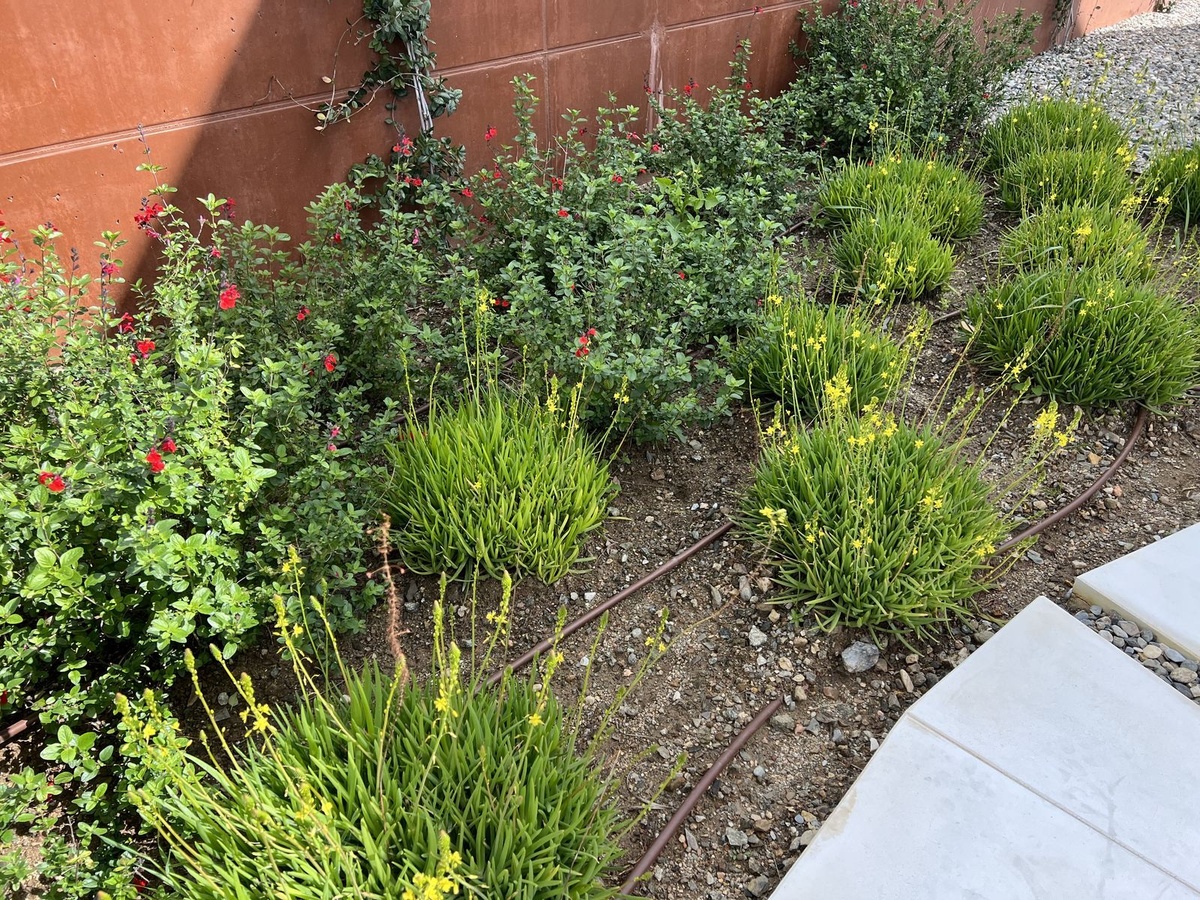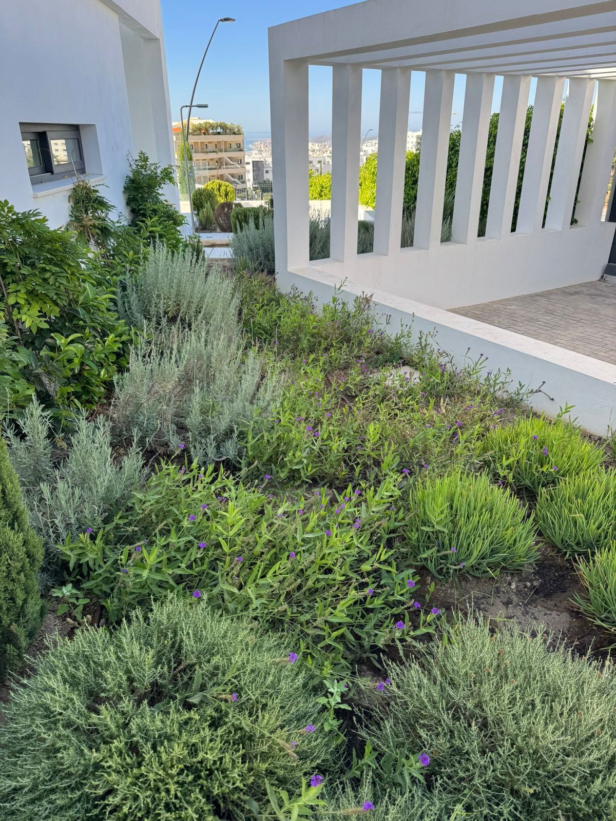 Aangelegde tuin met irrigatiesysteem, palmbomen, olijfboom, bloemen en struiken
