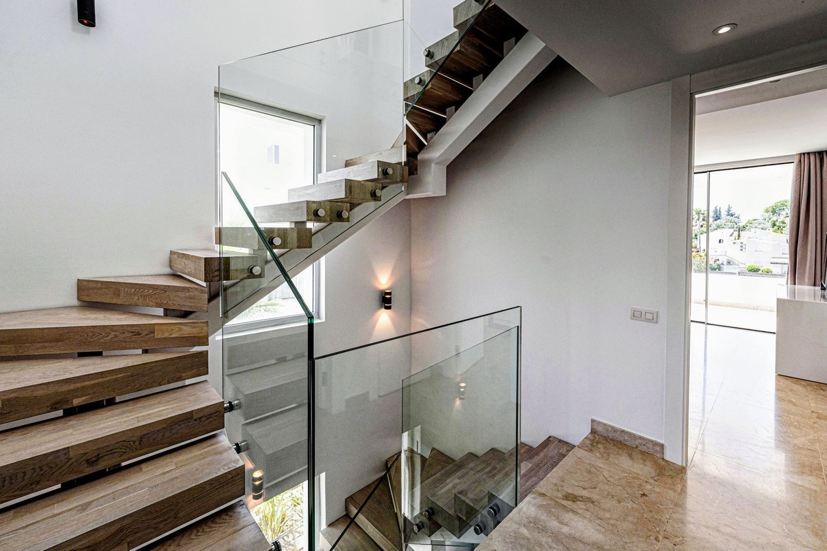 Boven heeft de hoofdslaapkamer voldoende garderobe-ruimte en een eigen badkamer, en een terras met uitzicht op zee, vergezeld van twee extra slaapkamers die een badkamer delen.