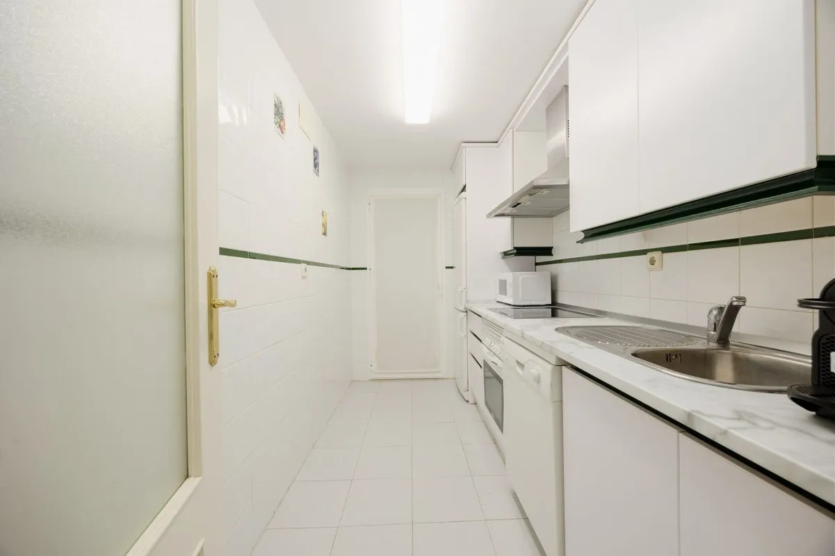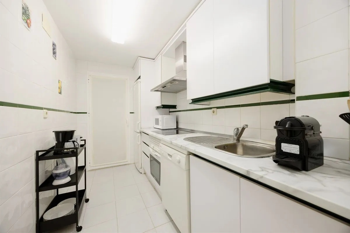 Bij het betreden van het appartement wordt u begroet door een prachtige gebogen ingang, die toegang geeft tot de kamer met het leven, met een 55-inch High Definition Smart TV.De keuken is volledig uitgerust met alle soorten apparaten: Nespresso Coffee Machine, magnetron, oven, thee en koffieset, vaatwasser, broodrooster en allerlei keukengerei en eenvoudige keukenbegrippen.De woonkamer geeft ook toegang tot een groot terras met een chill-out gebied en een eettafel, perfect om te genieten van buitenmaaltijden.
