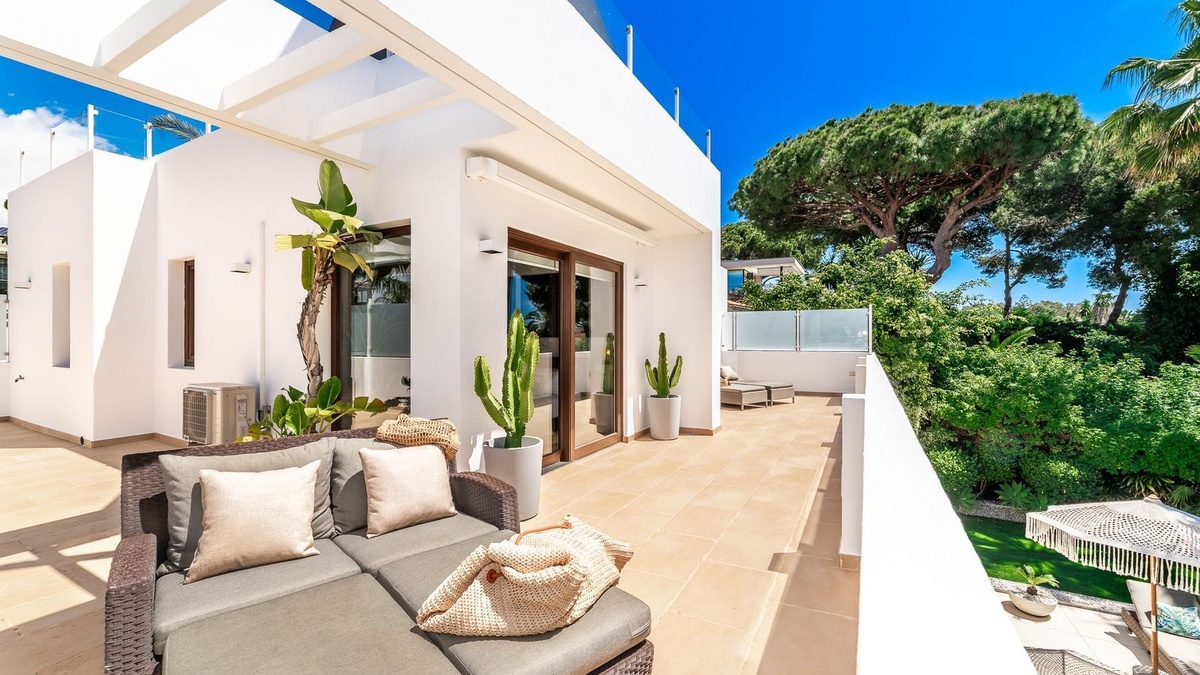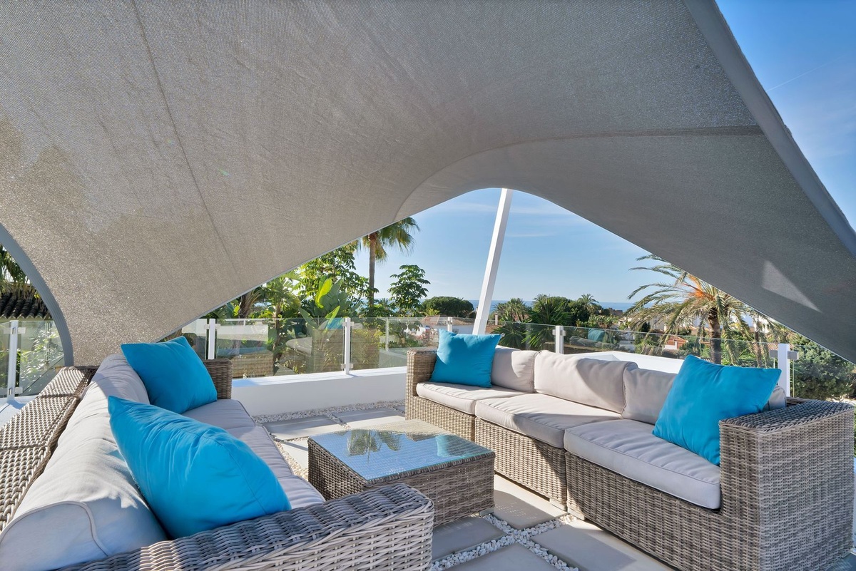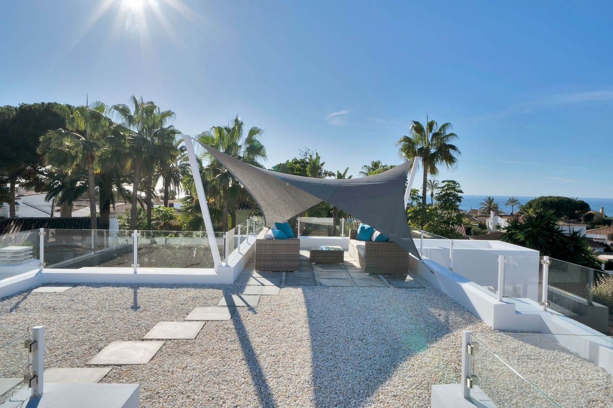 Vanaf hier leidt een trap naar het dakterras, waar een relaxlounge een panoramisch uitzicht biedt over Marbesa en de glinsterende zee – perfect om te ontspannen met een cocktail bij zonsondergang.