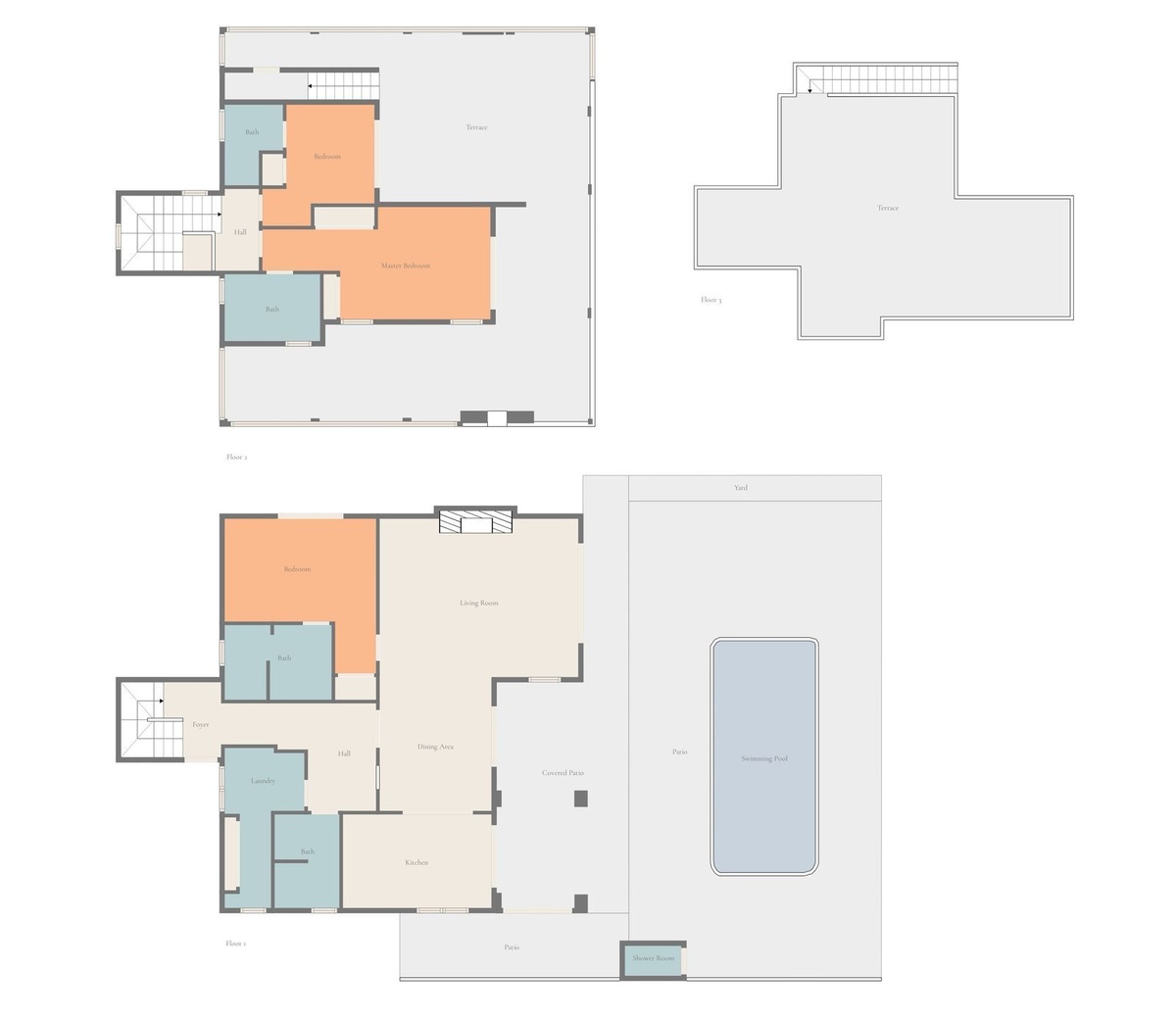 De bovenverdieping beschikt over twee extra slaapkamers met een en-suite badkamer, elk met toegang tot een ruim terras dat de essentie van het mediterrane buitenleven weerspiegelt.