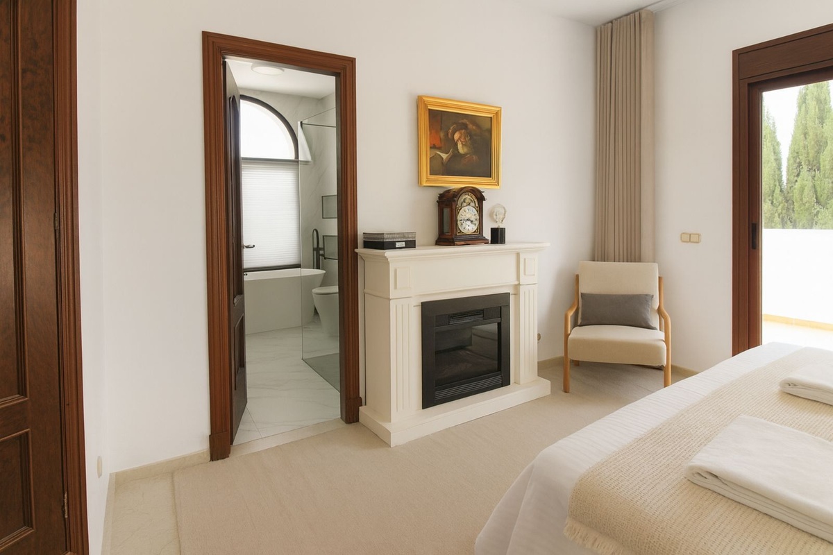 Boven is de hele bovenverdieping gewijd aan de hoofdsuite. Deze luxe slaapkamer heeft een eigen badkamer en directe toegang tot een privéterras met sereen uitzicht op de omliggende bergen - de perfecte plek om te ontspannen en tot rust te komen.