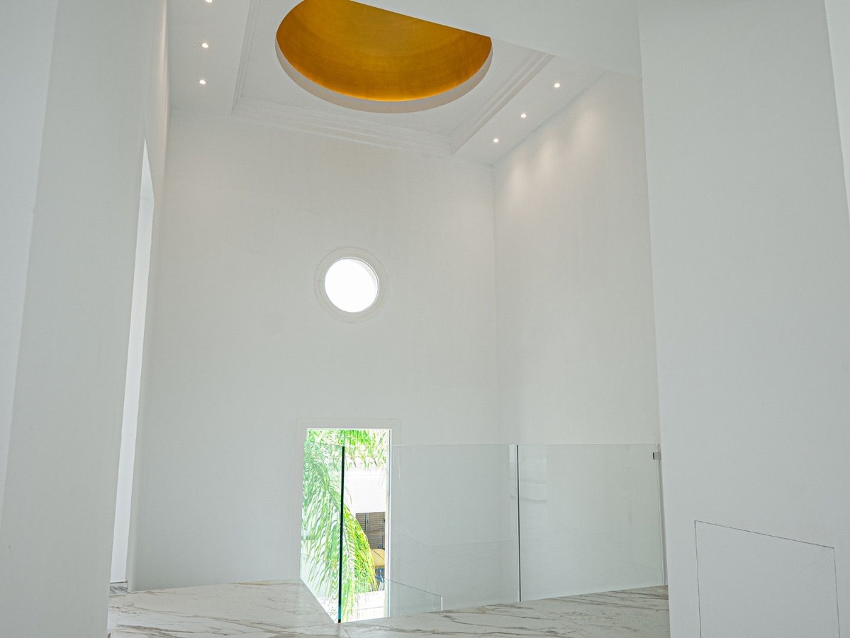 De villa is verdeeld over drie ruime niveaus en heeft een ideale indeling voor zowel het dagelijks leven als entertainment.De begane grond verwelkomt u met een indrukwekkende inkomhal, compleet met verfijnde pilaren en marmeren vloeren die meteen een luxueuze toon zetten.De open woonkamer is voorzien van een grote open haard, die een warme en uitnodigende sfeer creëert, terwijl de bovenste verdieping baadt in natuurlijk licht dankzij een prachtig gewelfd plafond en grote ramen.