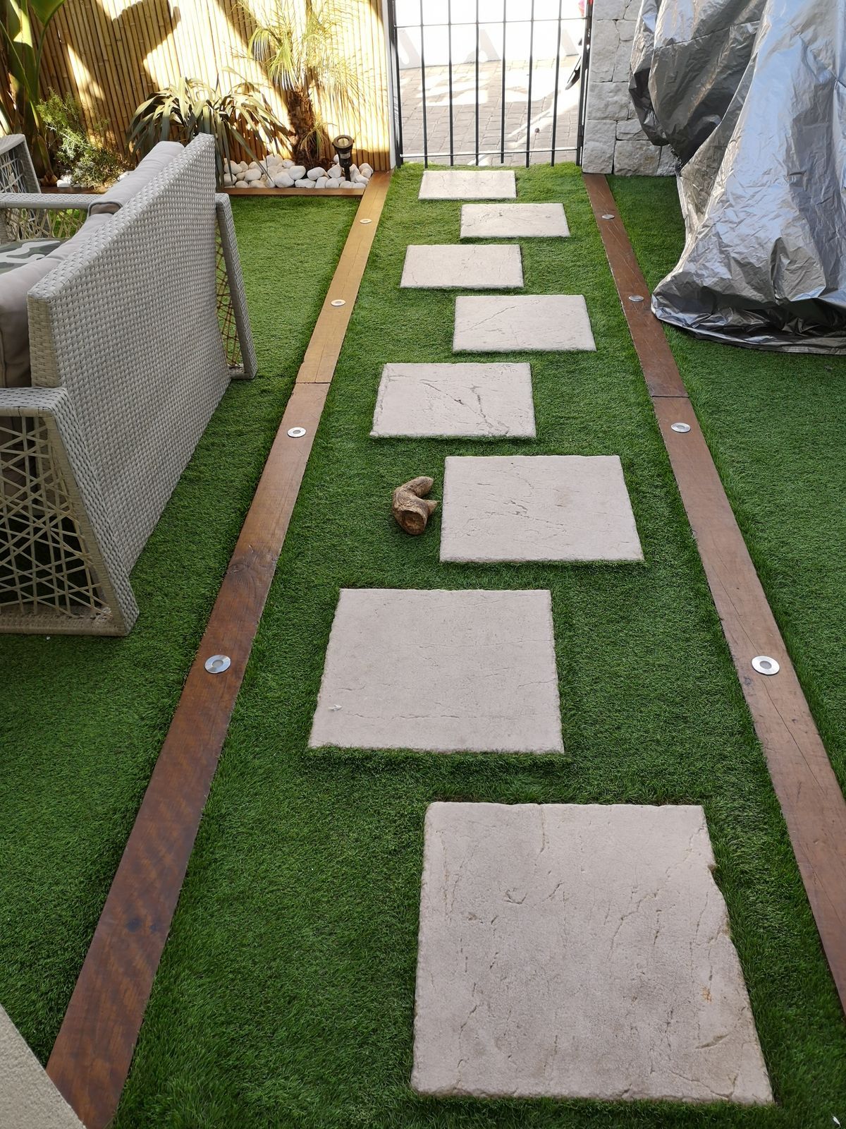 The exterior features a front garden, a rear patio with a covered barbecue area, marble countertops and a set of stairs made of Turkish travertine leading to an elevated second terrace. The property also includes three private underground parking spaces and a storage room, which is a key advantage in this area where parking is limited.