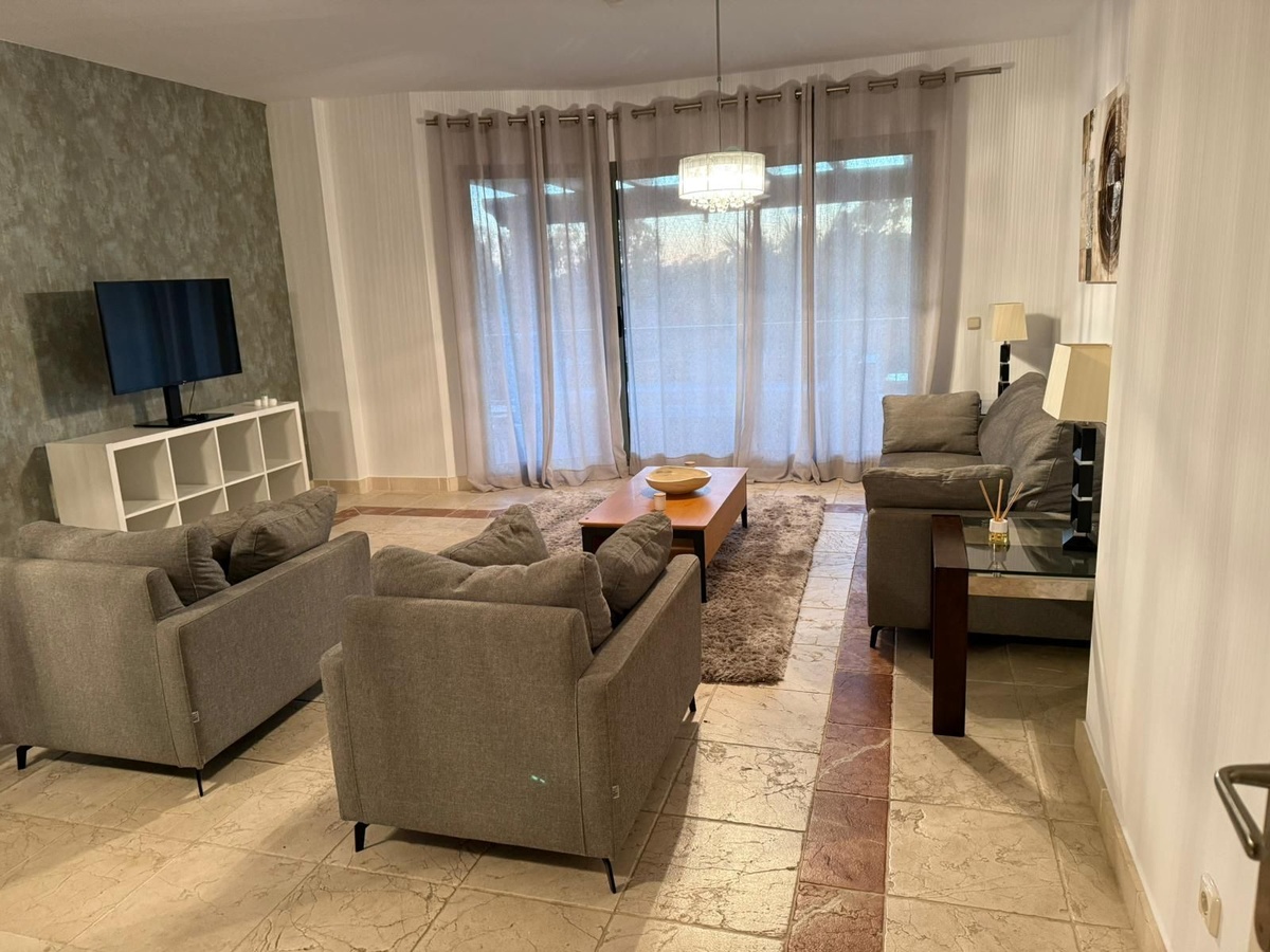 Uitgebreiding 156 m² privéterras met panoramisch uitzicht op de golfbaan, platteland en de Middellandse Zee Zee