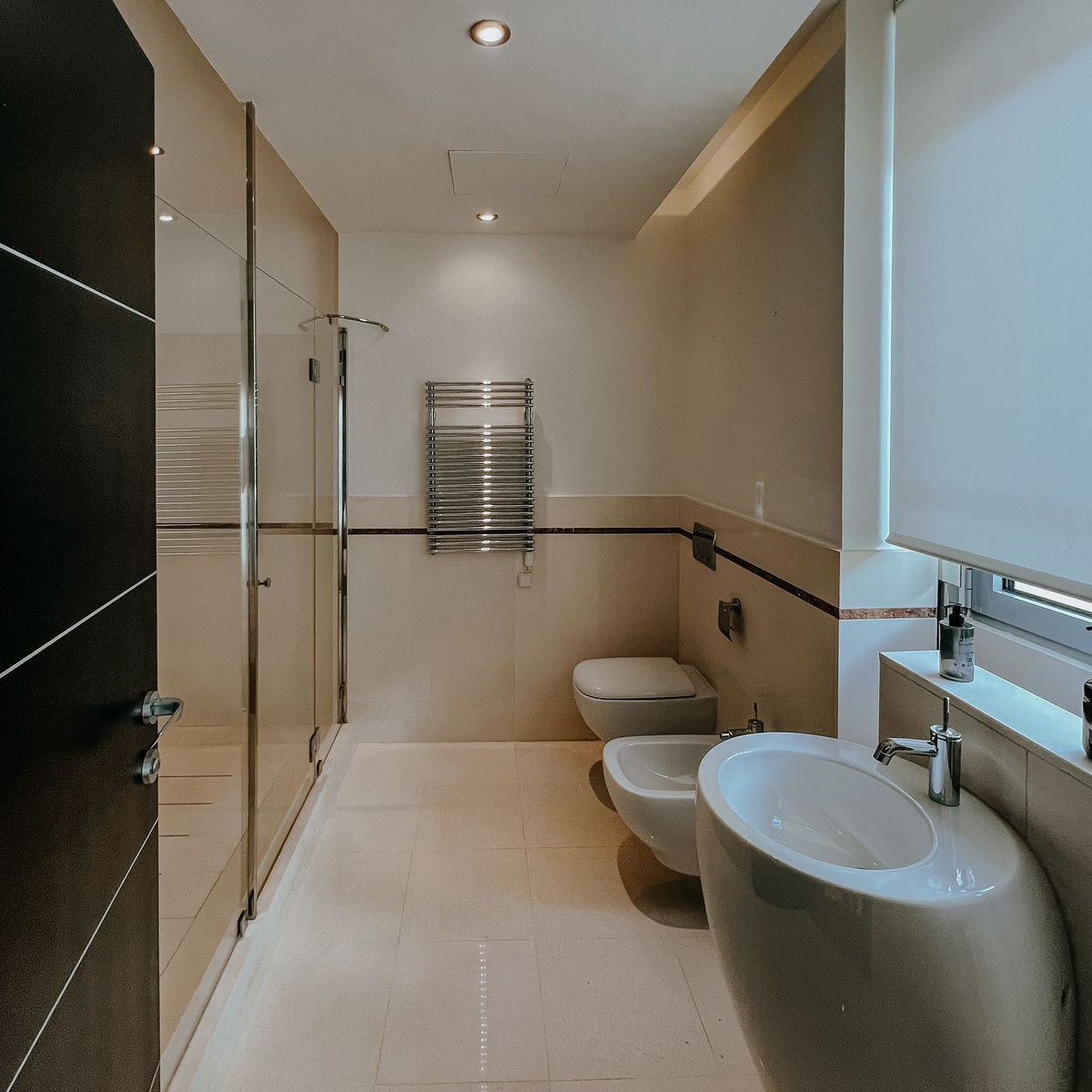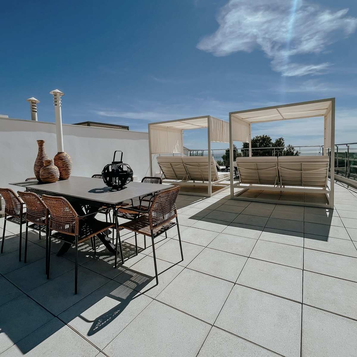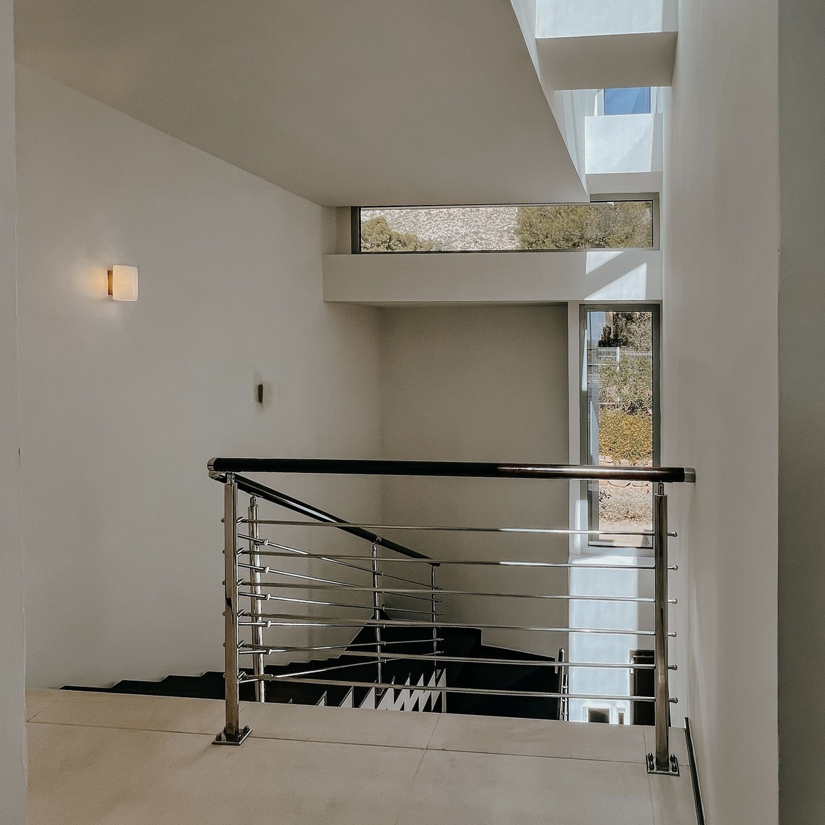 3 bedrooms and 3 en suite bathrooms plus 1 guest toilet, It has sea views from the ground floor, first floor and the solarium. private garage for two cars and storage room. underfloor