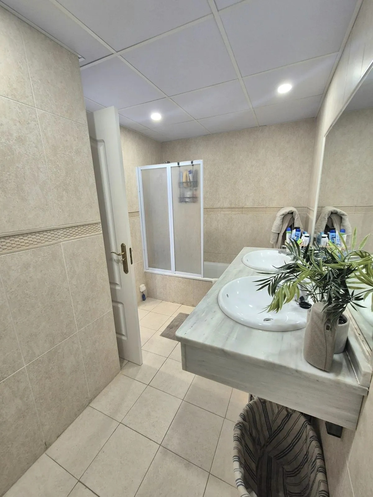 Binnen verwelkomt het pand u met een lichte en luchtige gang.Aan de rechterkant bevindt zich de hoofdslaapkamer met inbouwkasten, een en-suite badkamer met dubbele wastafel en een bad/douchecombinatie en toegang tot één van de drie grote terrassen.De hoekwoonkamer is gevuld met natuurlijk licht dankzij de twee sets openslaande deuren die leiden naar twee ruime terrassen op het zuiden, waar u kunt genieten van een prachtig uitzicht over de golfbaan en de bergen.