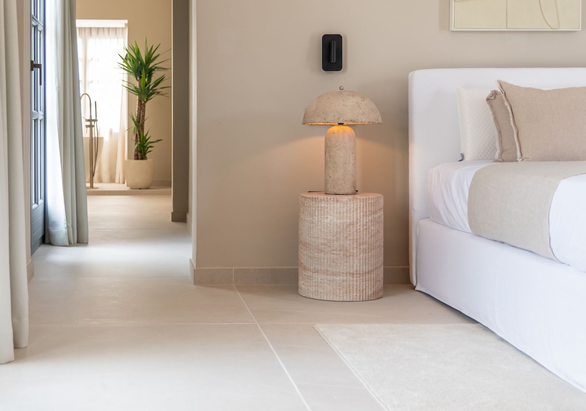 Inside, the atmosphere is warm and inviting, with modern finishes softened by natural wood accents. The open-plan kitchen and dining area flow seamlessly, with the kitchen fitted with high-quality Siemens appliances for those who love to cook. The living space opens directly onto a charming chill-out terrace, perfect for unwinding with friends or enjoying a quiet evening. Every corner of the home has been designed with comfort and hospitality in mind. Interior & exterior furniture by KOA Interior.