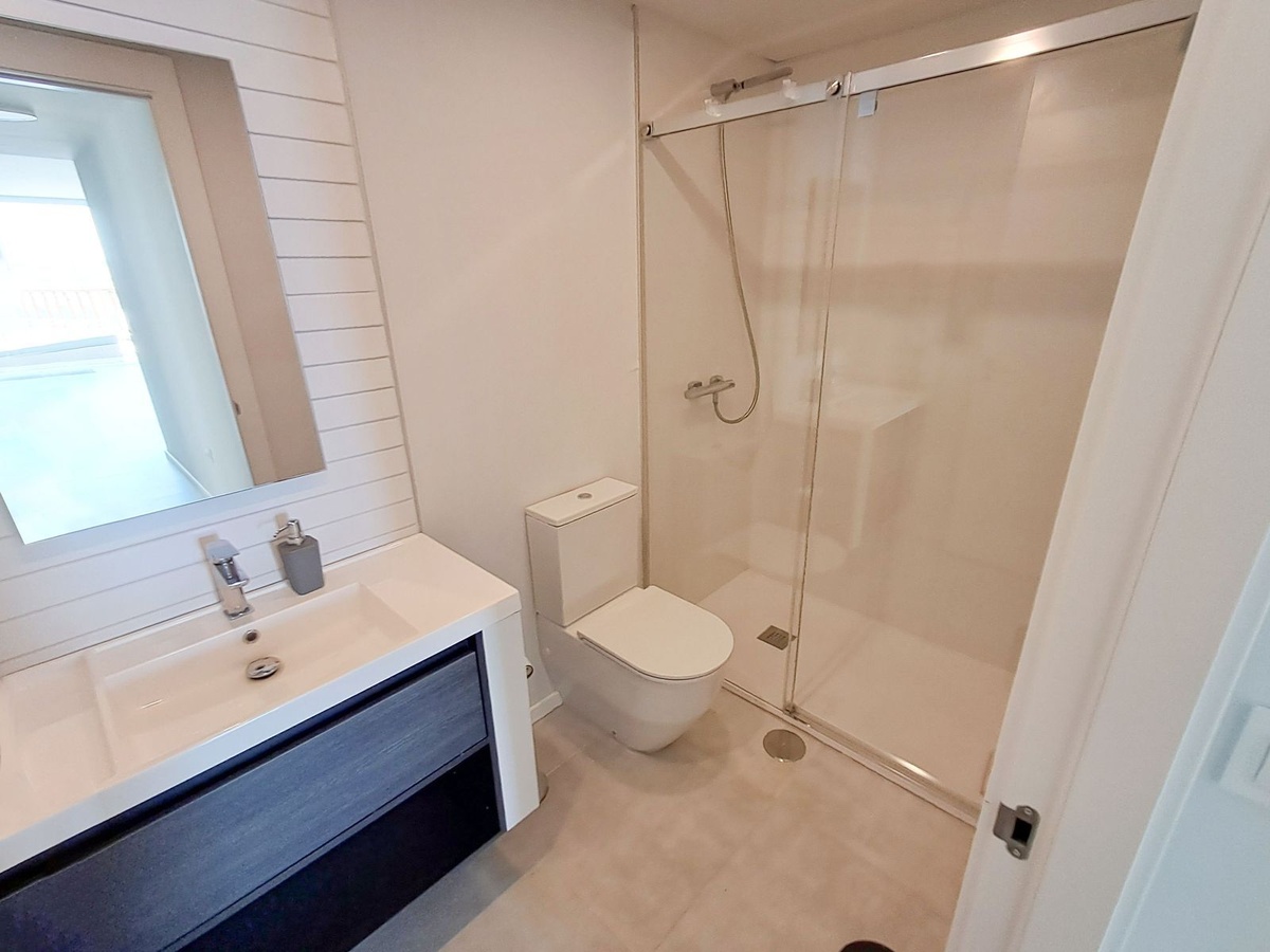 De ingang opent in een heldere open keuken die naadloos in het woon- en eetgedeelte stroomt.Vanaf hier leiden grote glazen deuren naar een prachtig terras met uitzicht op zee - de perfecte plek om te genieten van de mediterrane zon en ontspannen buitenleven.