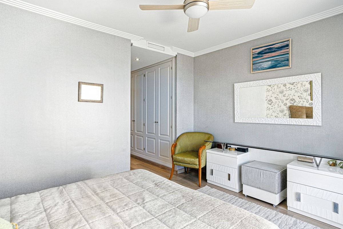 Op de eerste verdieping vindt u twee slaapkamers, beide met toegang tot een terras met panoramisch uitzicht op zee.De hoofdslaapkamer heeft een elegante en-suite badkamer, terwijl dit niveau ook een extra badkamer en een gezellige zithoek omvat.