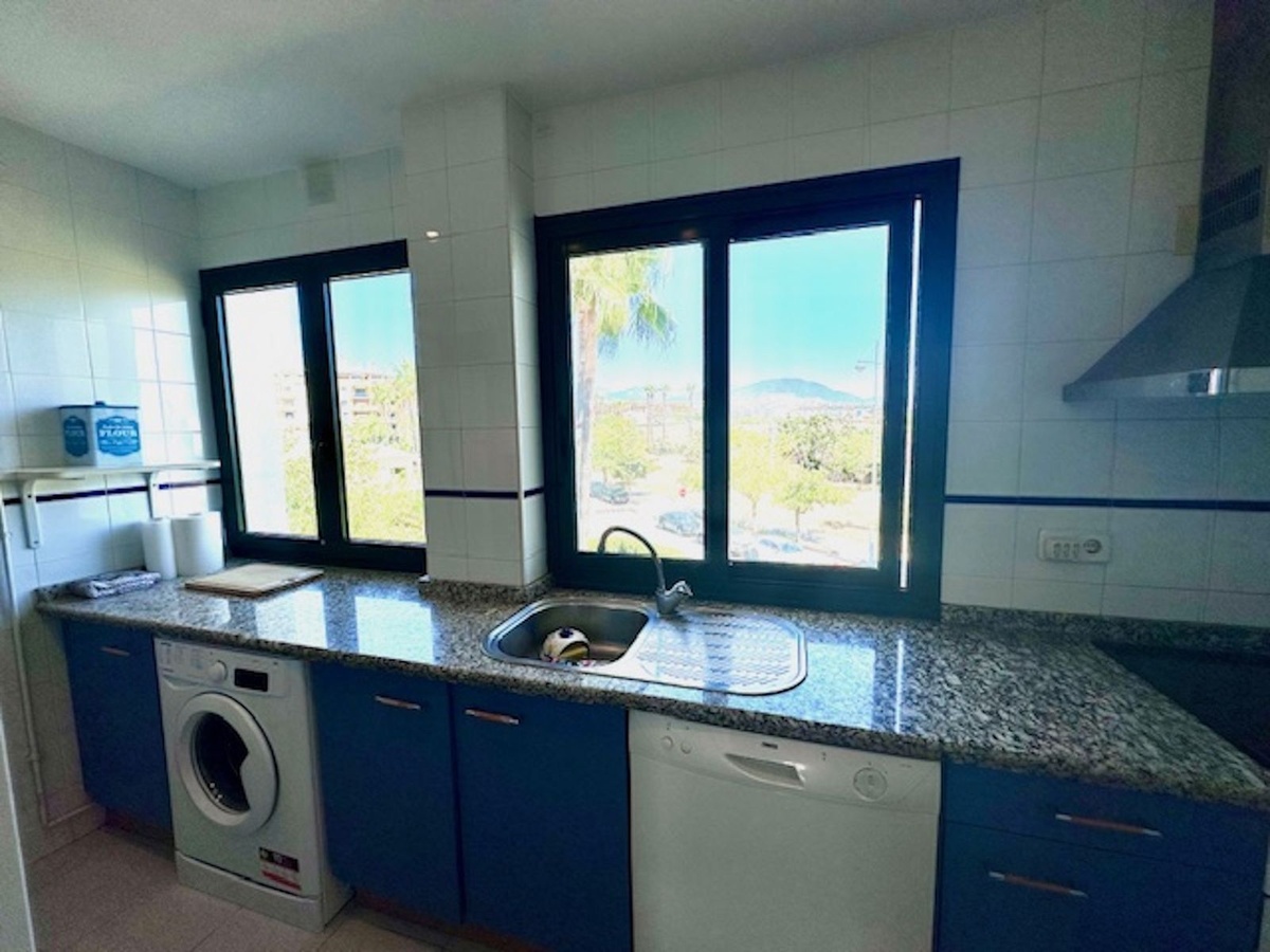 Fully equipped kitchen overlooking the complex, with natural light and windows