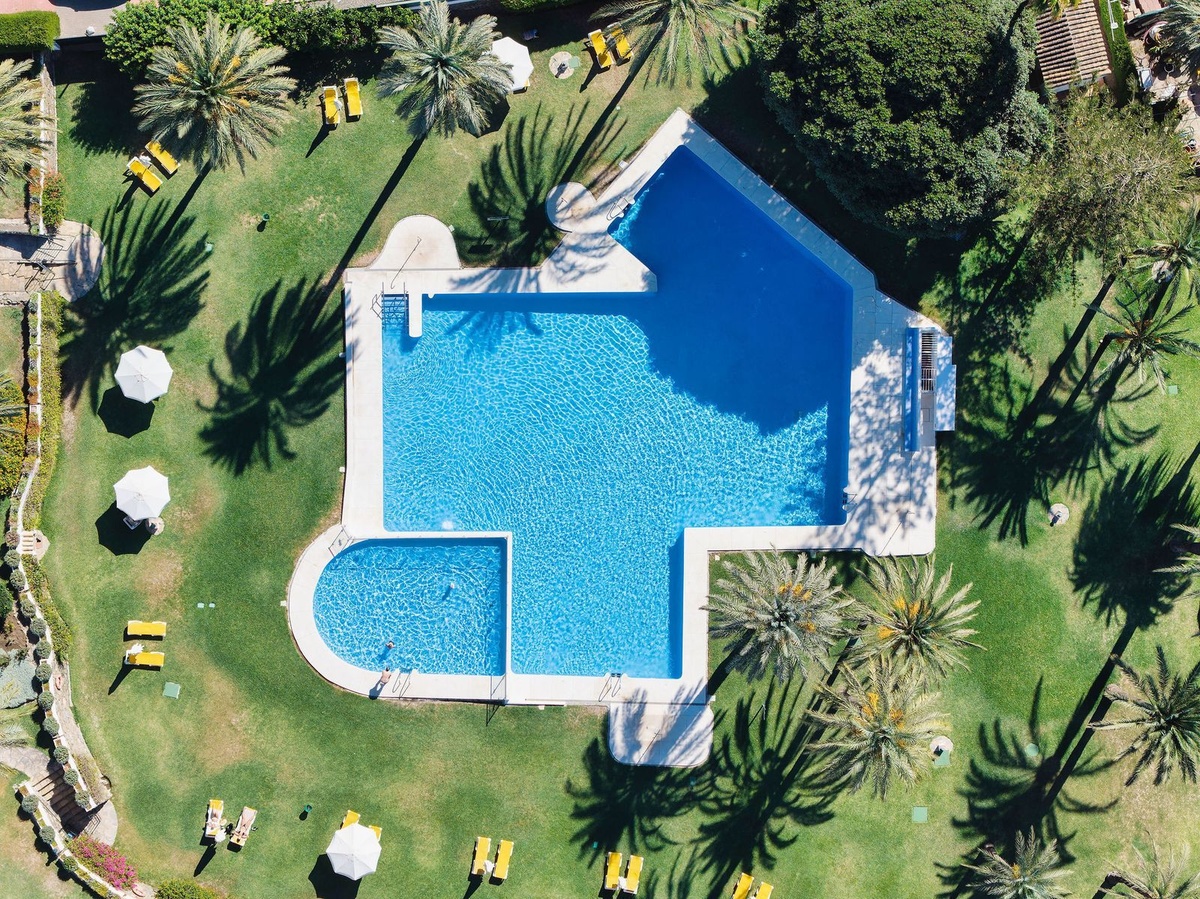 Het appartement beschikt over twee terrassen: een terras op het zuiden met directe toegang tot het zwembad en de tuinen, plus een uitnodigend patioterras bij de ingang – ideaal om te genieten van de ochtendzon of als extra eetplek.