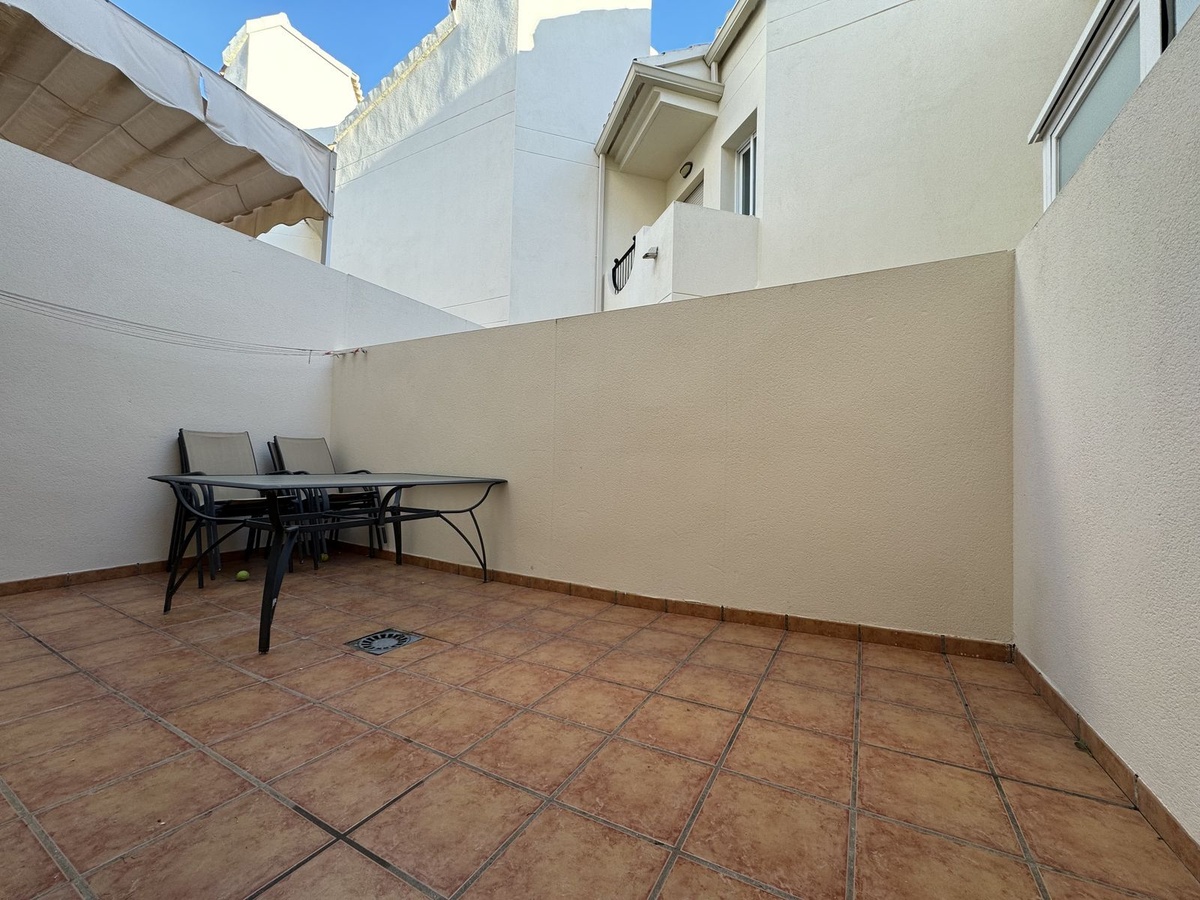 Bij binnenkomst vanaf de tuin vinden we het voorterras en de ruime woonkamer, een badkamer, de eetkamer en de keuken. Achter de keuken bevindt zich een ander terras met een kleine berging.