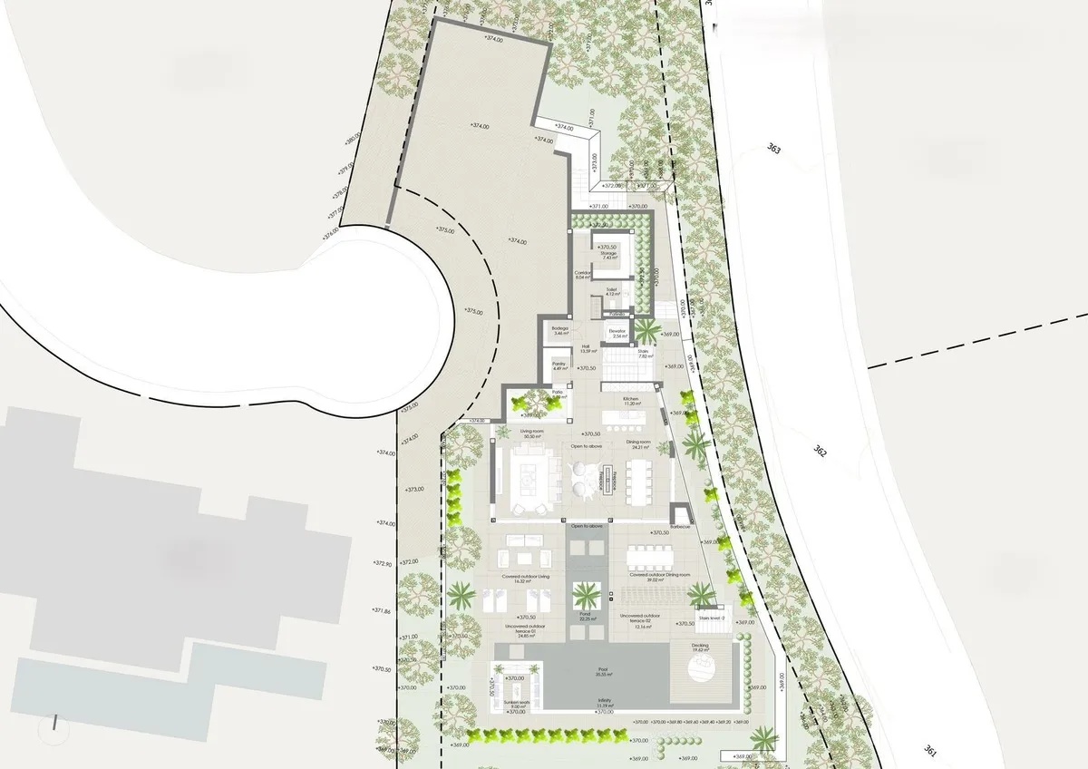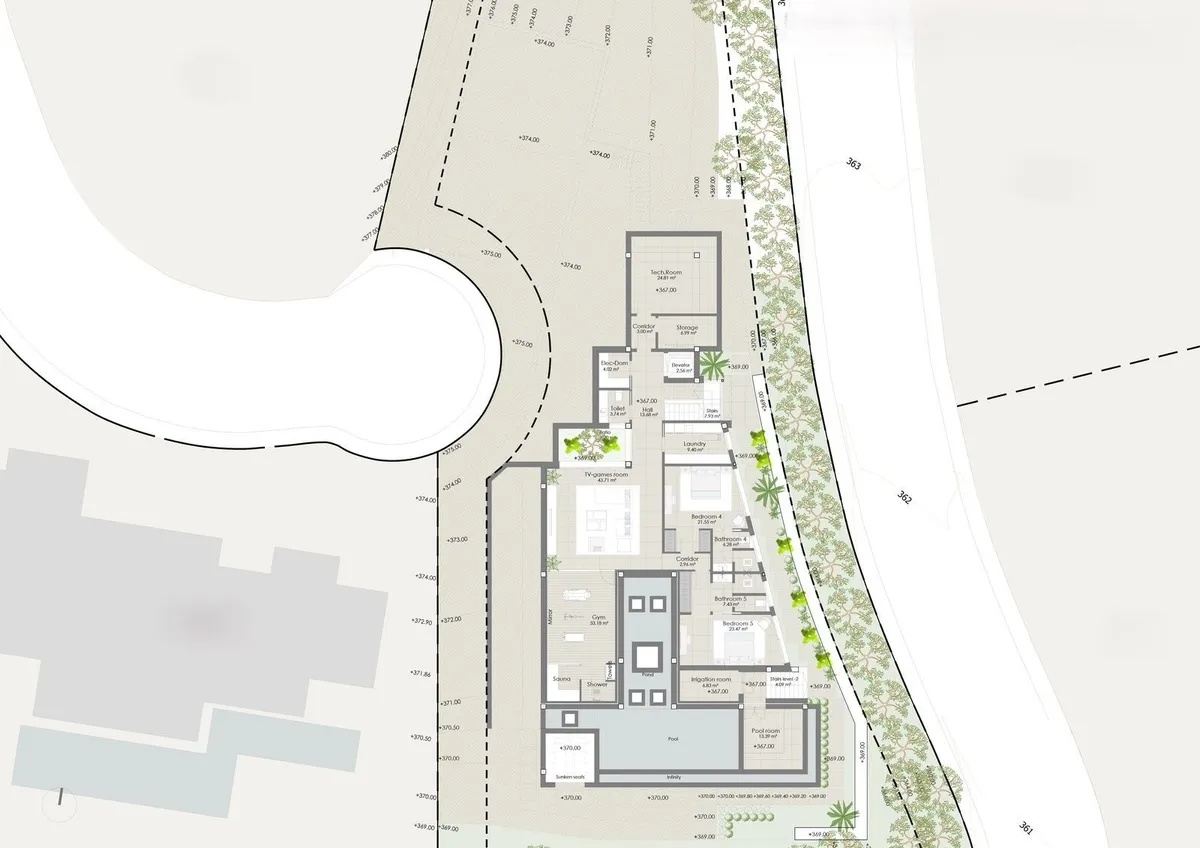 The project is designed with five spacious bedrooms and seven opulent bathrooms across three meticulously planned levels. Quality is paramount, with high-grade materials used throughout the property. This exquisite villa offers an array of high-end amenities, including a full gym, private cinema, game room, wine cellar, elevator, and sauna. Every detail has been thought of to provide you with the ultimate luxury living experience.