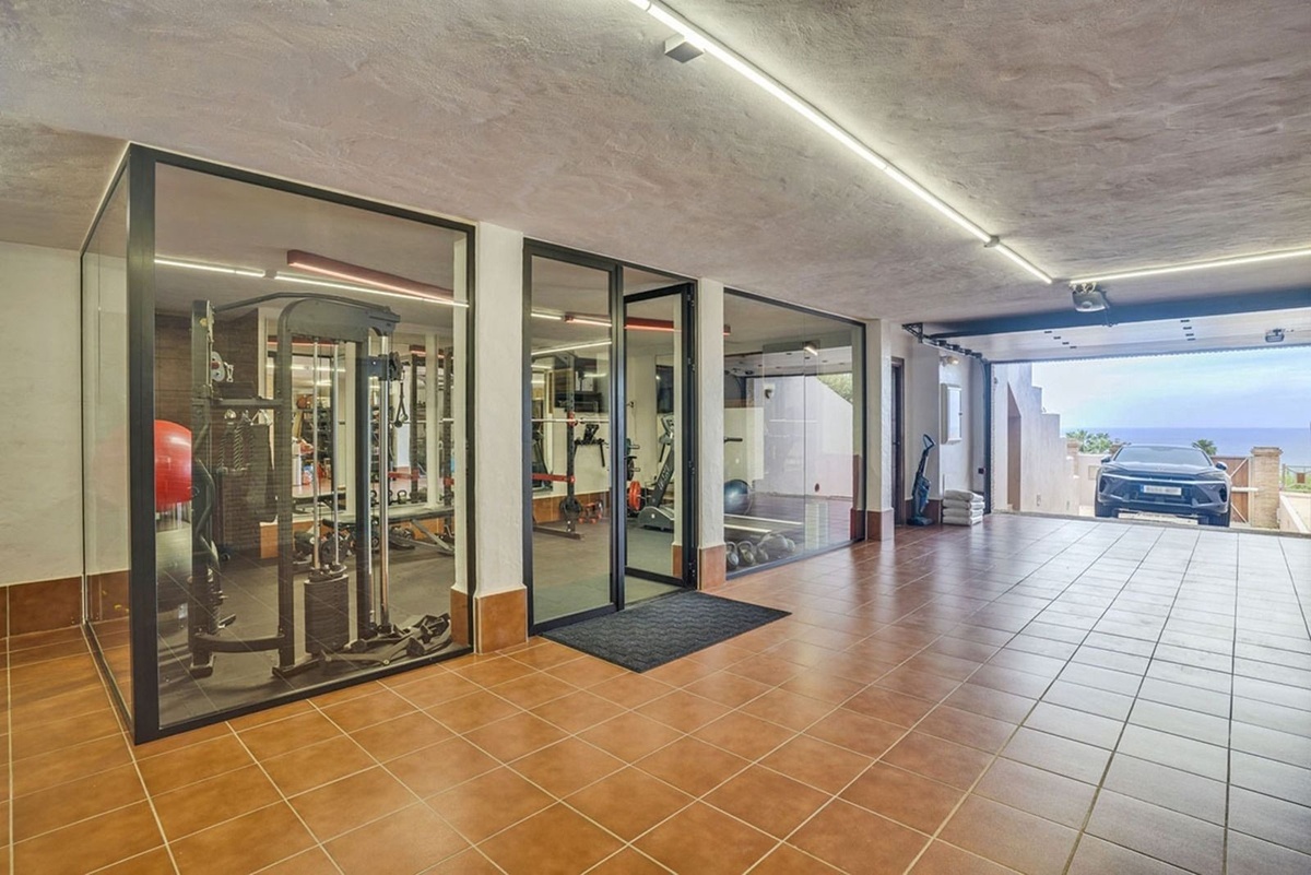 From the kitchen, there is access to a large laundry room with space for a washing machine, two dryers, and ample storage capacity. The property also includes a modern private gym next to the garage, a storage room, and a workshop area, optimizing space usage.