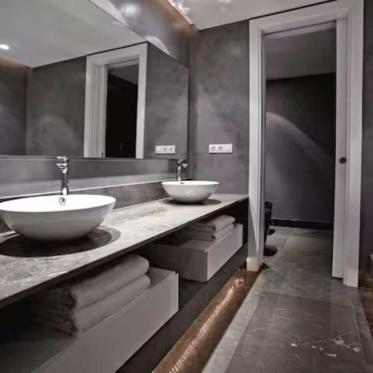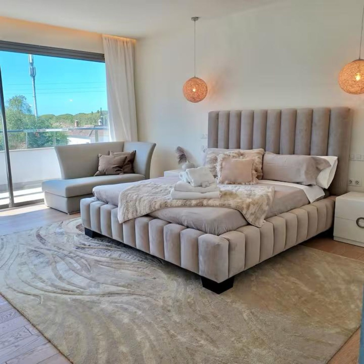 Each bedroom has been designed to promote peace and relaxation, decorated with soft tones and high-quality finishes. The master suite includes a private terrace, large dressing area, and an elegant ensuite bathroom. The open-plan living room features contemporary furniture, a fireplace, and direct access to the outdoor chill-out area.