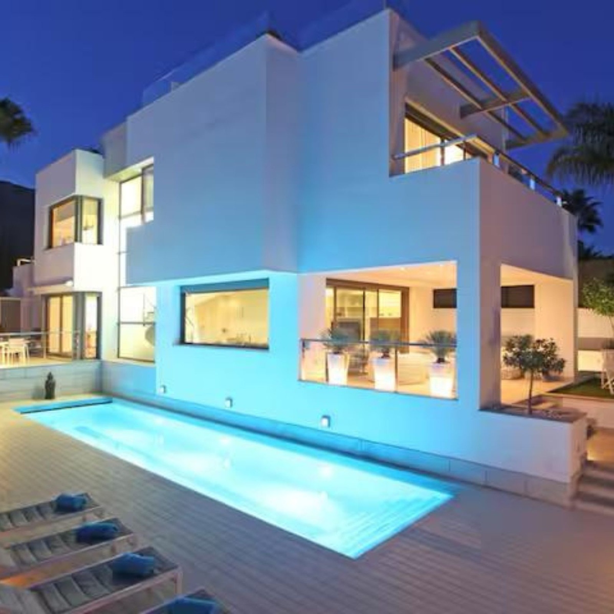 The villa features 4 spacious bedrooms, 5 beds, and 3.5 bathrooms, all designed with style and comfort in mind. Large panoramic windows flood the interior with natural light, seamlessly connecting the open-plan living areas with the terraces and poolside.