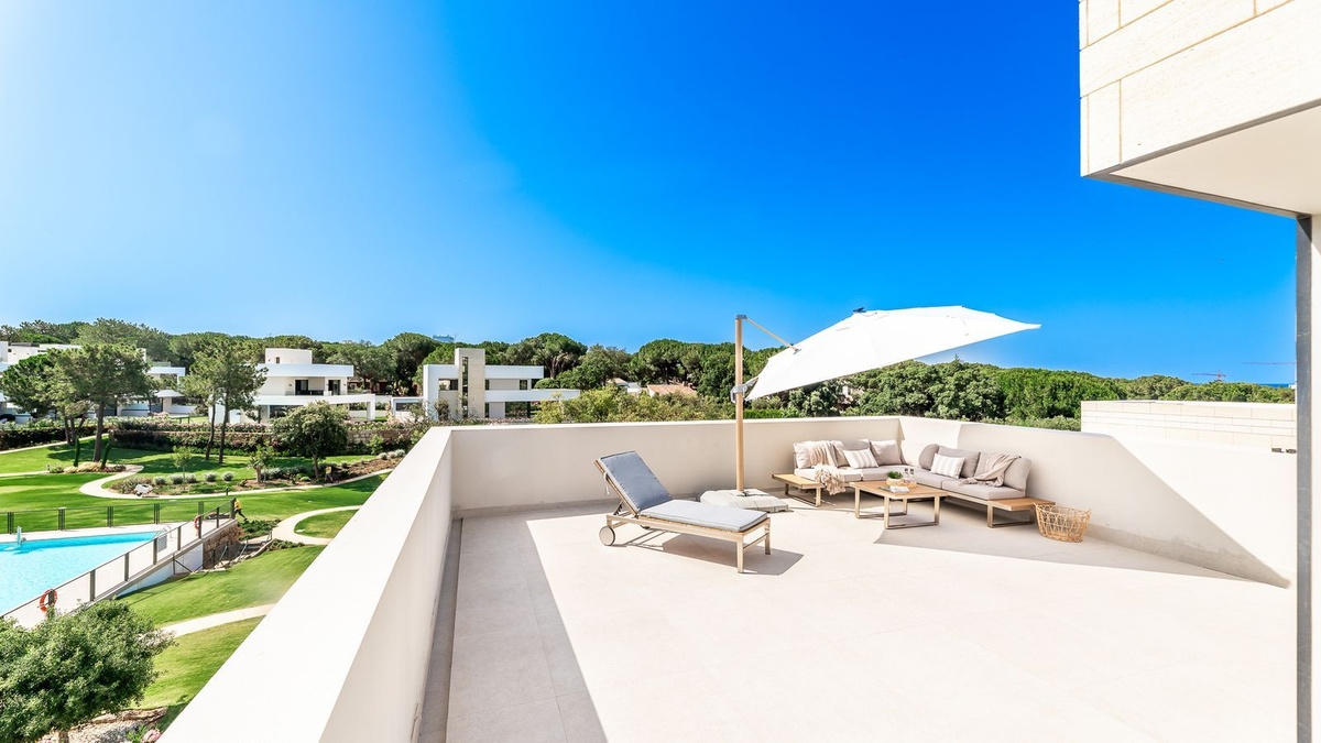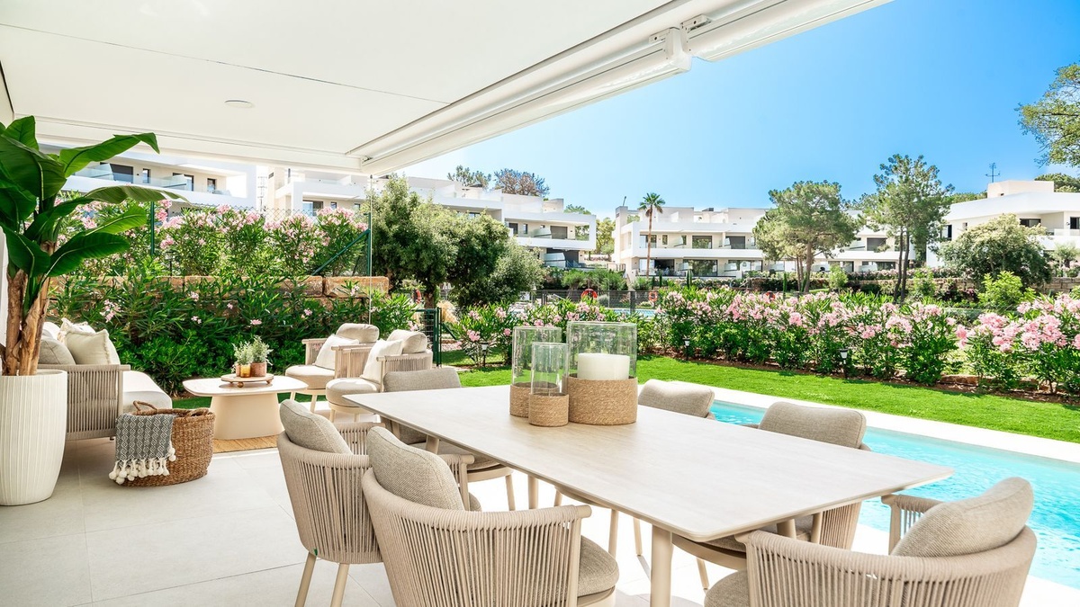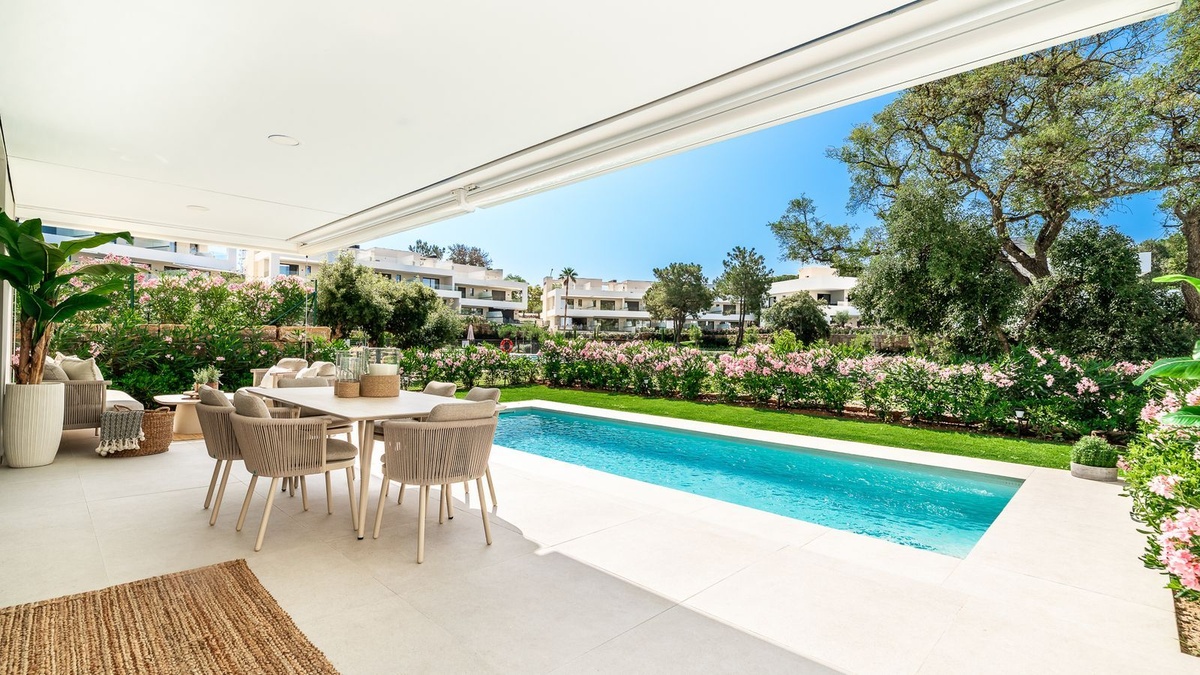 Boven komen de master suite en twee extra slaapkamers elk uit op ruime terrassen met uitzicht op de tuinen, wat een rustige en privé-retraite creëert. Een dakterras bekroont de woning met een panoramisch uitzicht - de ideale setting om te zonnebaden, gasten te ontvangen of gewoon te genieten van de mediterrane bries.