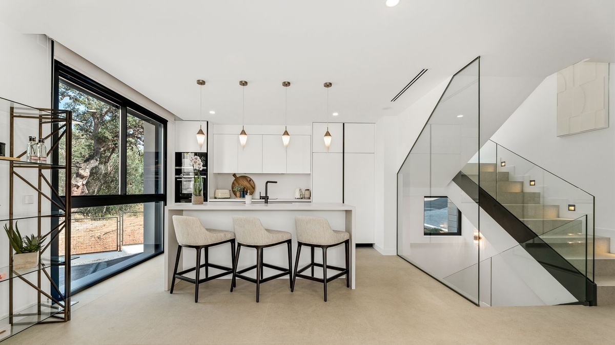 De begane grond beschikt over een lichte, open woon- en eetkamer die naadloos aansluit op de terrassen en de tuin. Een volledig uitgeruste designkeuken met Siemens apparatuur en Silestone werkbladen voegt een moderne touch toe, terwijl een gastenslaapkamer met en-suite badkamer deze verdieping completeert.