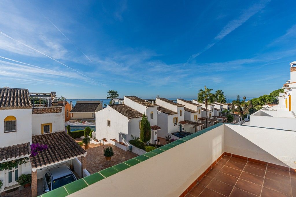 Ample and bright semi-detached house in the urbanisation Costabella in East Marbella. The house offers on two levels three bedrooms, three bathrooms, a good sized living room, big kitchen, front terrace and back summer terrace. Amazing sea views from first floor and from roof terrace. The house offers great potential as there is a basement that could be converted into more bedrooms or whatever you like. Amazing complex within a couple of steps from the beach with large pool area, garden and parking space area. Marbella Centre is only a 10 minute drive away.