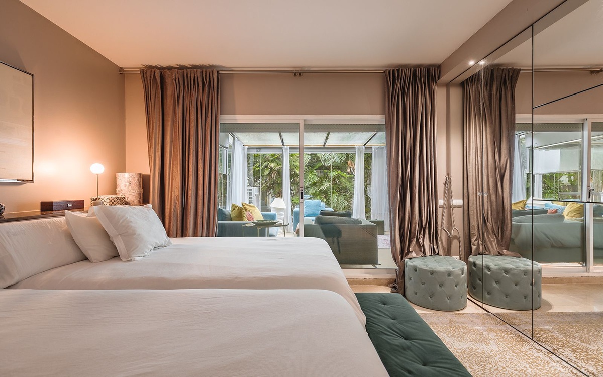 Exquisitely presented ground-floor apartment located in a 24-hour secured complex in Las Lomas del Marbella Club, in the heart of the Golden Mile. The property has been completely renovated and makes incredible use of the open floor plan that blends the kitchen, living room and large outdoor terrace seamlessly. Large floor-to-ceiling windows open up from the living room to a lush tropical garden and covered terrace with adjustable glass curtains that can be opened in the summer months to provide an incredible entertaining space within a very private setting. The apartment makes the most of the square meters and provides two spacious bedrooms, each with their own en-suite bathroom. The master bedroom opens up and connects with the large terrace towards the back of the unit. The complex offers an outdoor pool with wonderful sea views, gym and sauna for residents. The property comes with 1 parking space and a large storage room. Situated in a sought-after area, approximately half-way between Marbella Town and Puerto Banús.