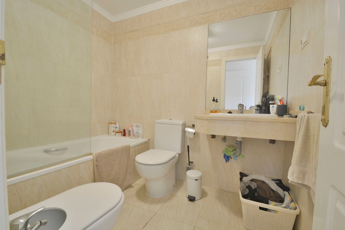 Fantastic apartment in Elviria-Marbella located on the golf course front line with open views and no buildings in front of you to block the view. The property is located in the gated complex El Mirador de Santa María Golf, surrounded by well-kept gardens and several swimming pools. The property has two bedrooms with built-in wardrobes, two full bathrooms, one of which is en-suite, a large, bright living-dining room with large windows, a separate fitted and equipped kitchen and a covered, sunny terrace. Parking space and storage room included. Very close to all amenities, such as supermarkets, banks, restaurants, pharmacies and the best beaches in Marbella. Just 35 minutes from Malaga International Airport. The property has potential, as it could be converted into a three-bedroom apartment, as some neighbours have done. Great opportunity. Come and visit! DS1