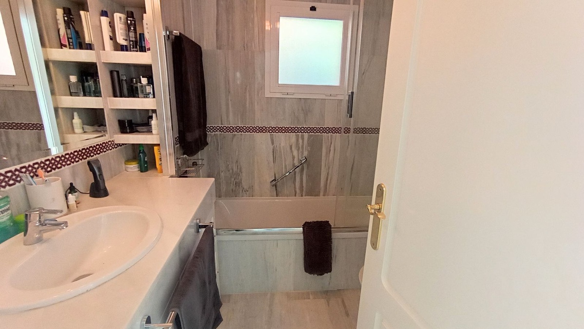 De woning is verdeeld over twee niveaus, verbonden door een interne trap.Op de begane grond vindt u twee lichte slaapkamers en twee badkamers, een volledig ingerichte keuken en een ruime woonkamer met toegang tot het terras.De bovenste verdieping beschikt over een derde slaapkamer met gastentoilet, momenteel in gebruik als gezellige tweede woonkamer en biedt directe toegang tot het spectaculaire solariumterras.Deze flexibele indeling is ideaal voor gezinnen, gasten of vakantieverhuur.