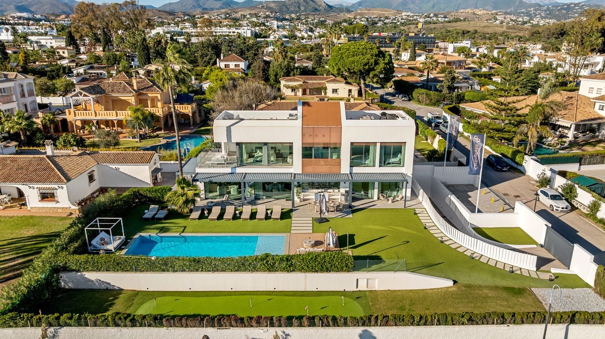 Boasting of panoramic sea views, a contemporary showpiece villa sitting in a privileged beachfront position in the New Golden Mile, surrounded by an expansive private garden with a large private swimming pool. The ideal family estate offering a dynamic outdoor lifestyle, perfect for water sports enthusiasts, with direct access to the beach from the front garden.