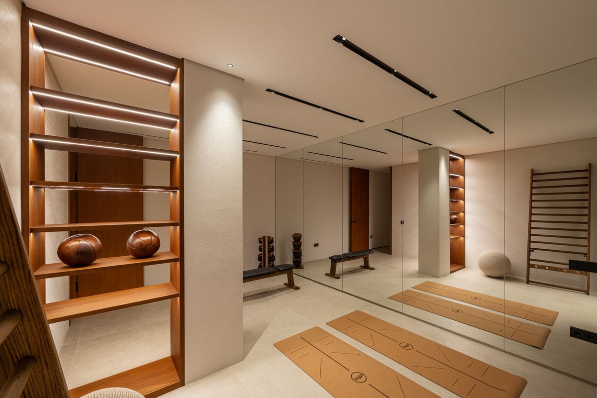 The kitchen and dining areas continue the same standard of design, offering a sleek layout with premium appliances, generous workspaces and ample storage. The open-plan configuration allows direct interaction with the living room and terrace, making the main level ideal for both daily living and entertaining. Large windows frame the exterior landscaping and views, turning every room into a vantage point.
