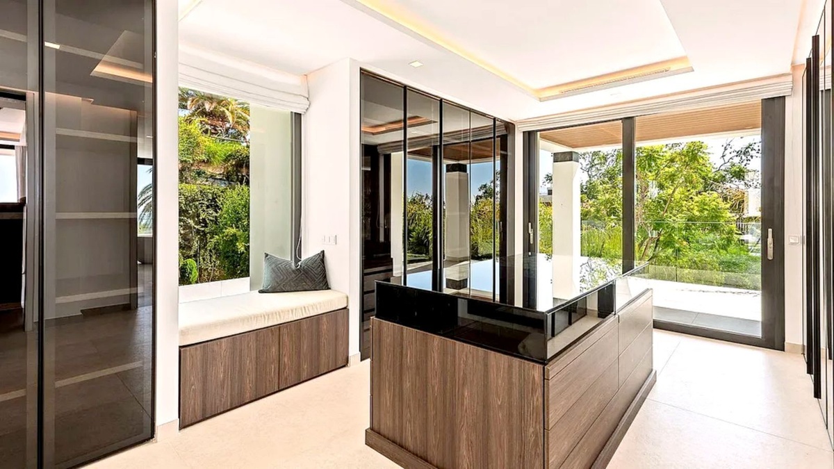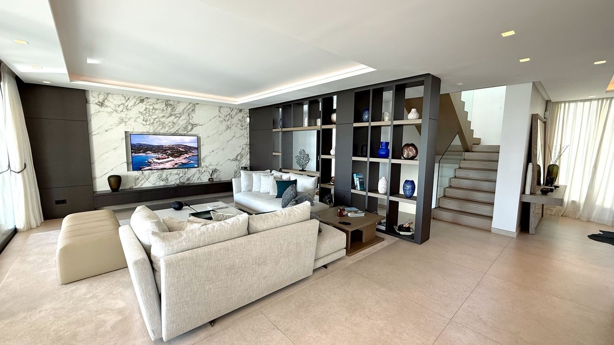 This home is packed with premium features, including air conditioning, a fully equipped kitchen, a cozy fireplace, jacuzzi, sauna, and a versatile basement. The villa also includes a guest room, gym, and top-notch security features for your peace of mind. The luxurious solarium invites you to soak in panoramic views of the sea, golf course, and countryside.