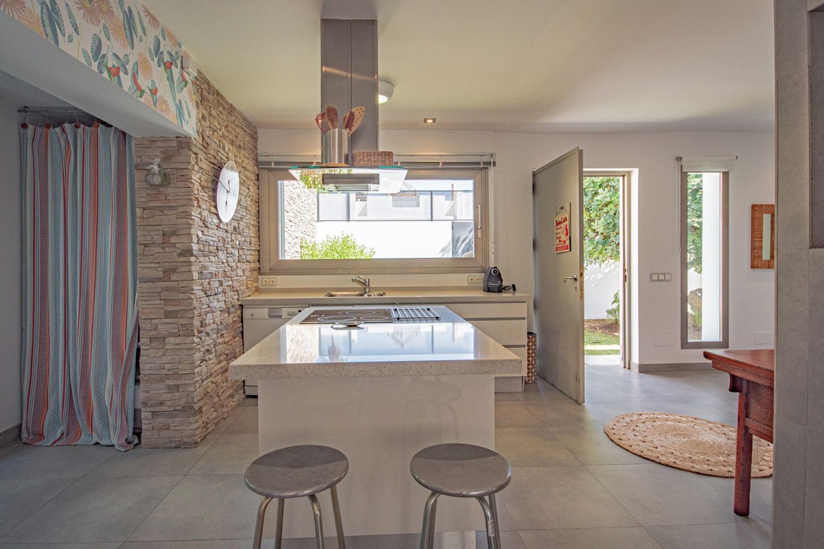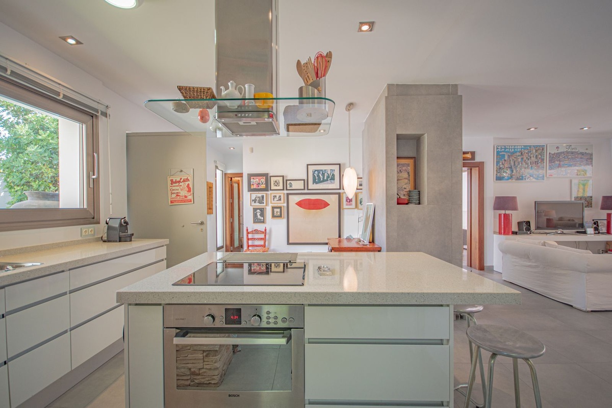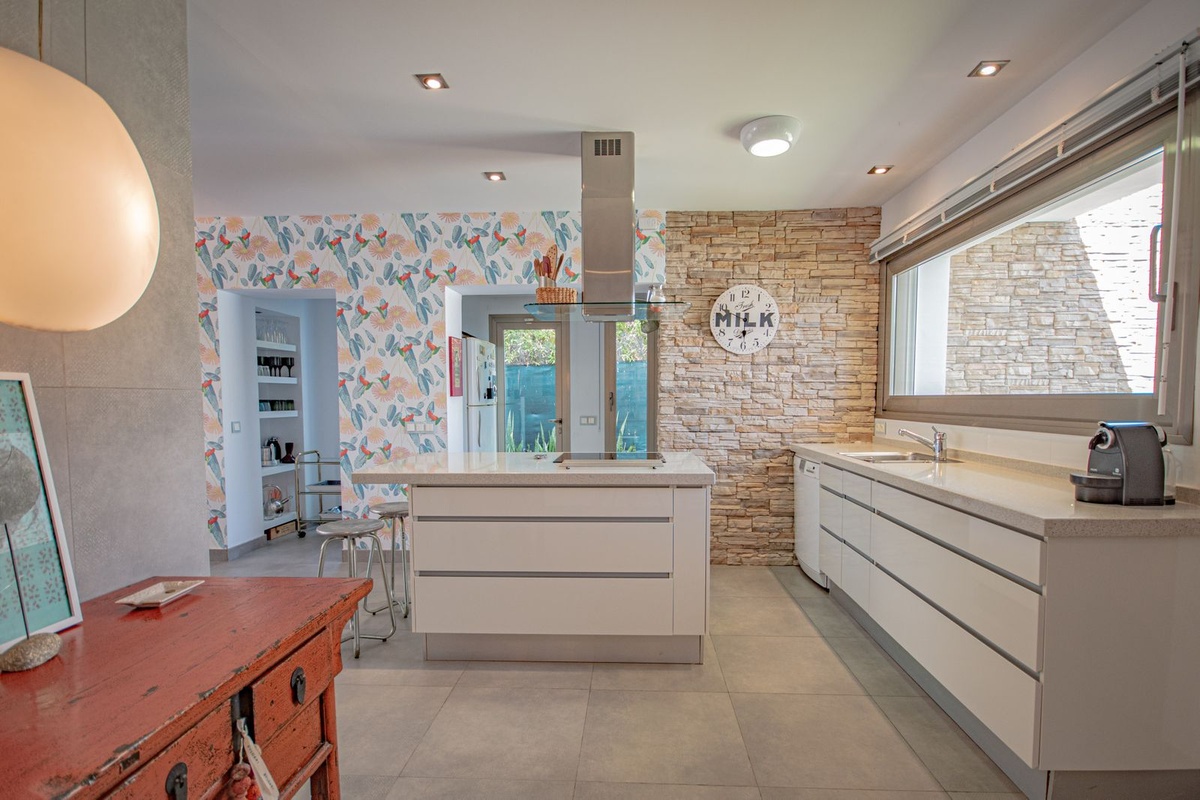 The fully equipped open-plan kitchen maintains the aesthetic consistency with the rest of the house: light-colored materials, straight lines, and a layout designed for everyday comfort. Ideal for long stays and for those who value practicality without compromising on design.