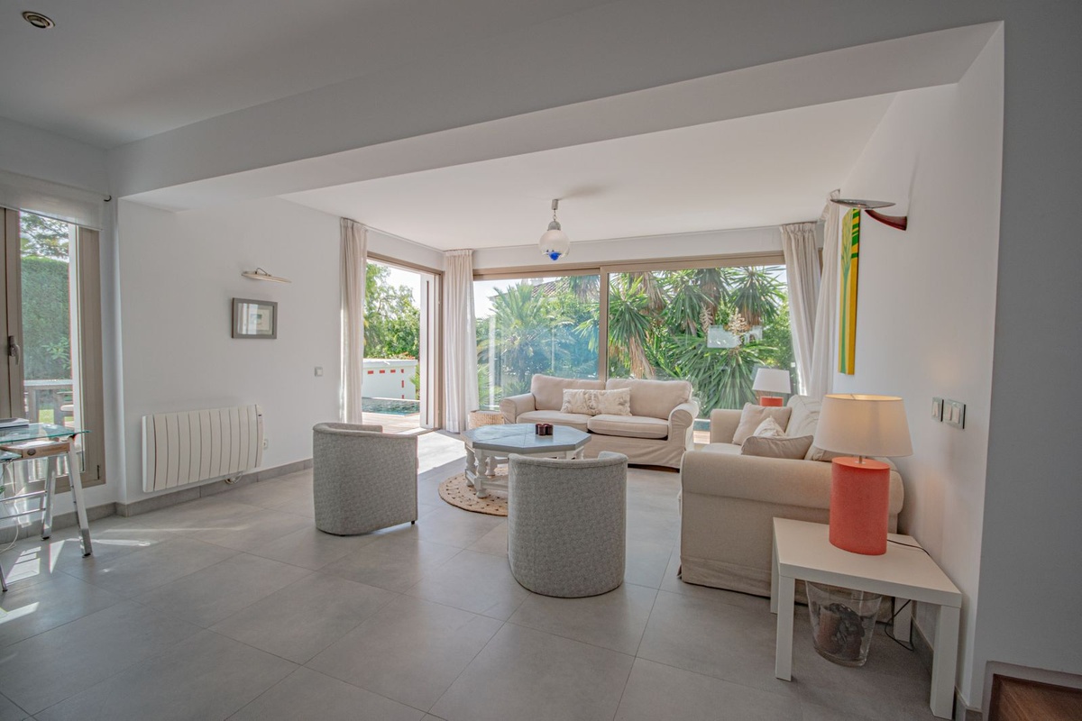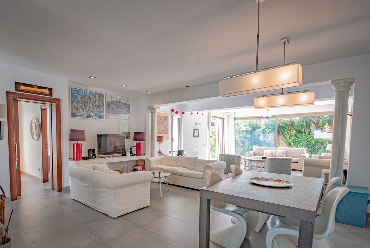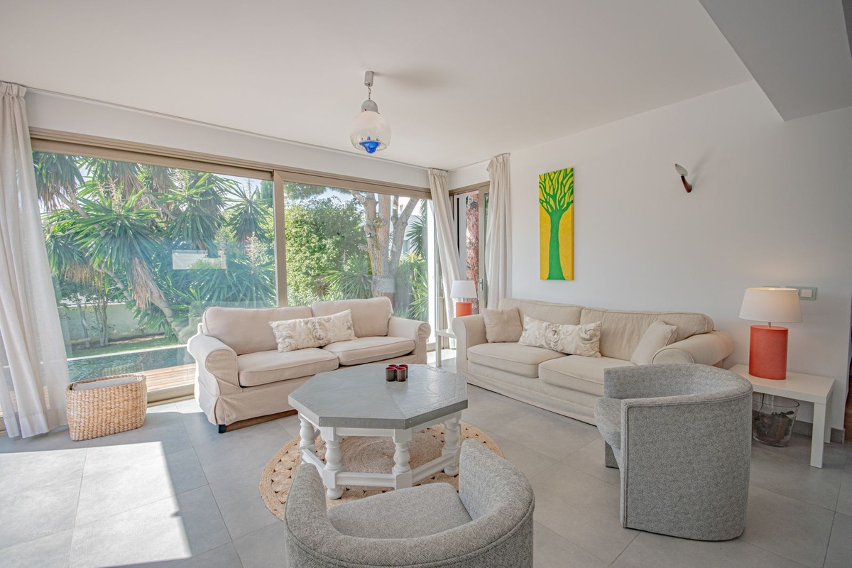 The spacious and bright main living room opens onto the outside through large windows, integrating the interior with the garden and terraces. Light floods every corner, accentuating the soft tones, clean lines, and calm atmosphere that define this home.