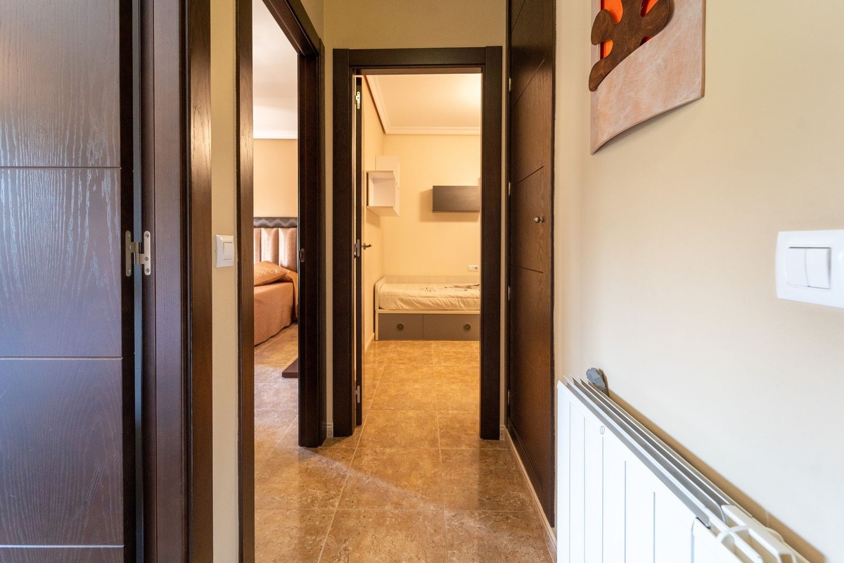 It features three bedrooms with built-in wardrobes, radiators in all rooms, hot and cold air conditioning in the living room, and a cozy interior patio with natural light leading to extra storage and entertainment space.