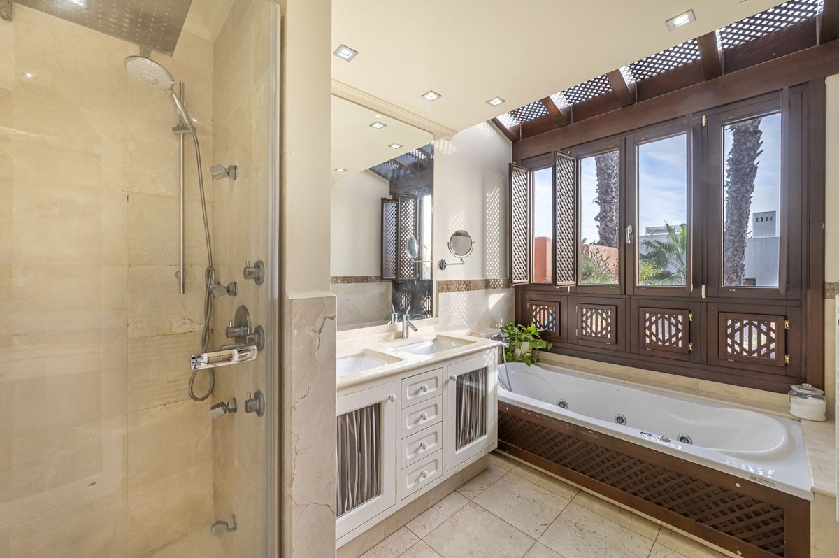 Finished to the highest standards, the townhouse is presented in immaculate condition and features treated marble flooring, wooden lattice details, independent climate control systems, extensive fitted wardrobes, a centralized vacuum system and a private lift serving all floors.