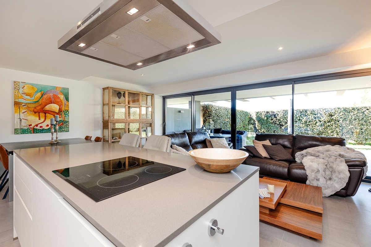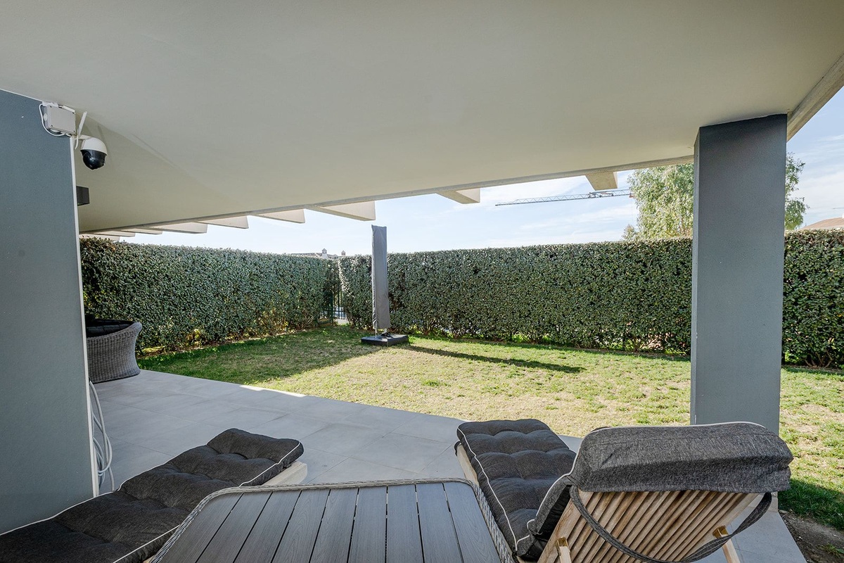 The apartment features a spacious open-plan living and dining area with large sliding glass doors that open directly onto a private garden, seamlessly blending indoor and outdoor living. The modern, fully equipped kitchen is finished to a high standard, perfect for both everyday use and entertaining.