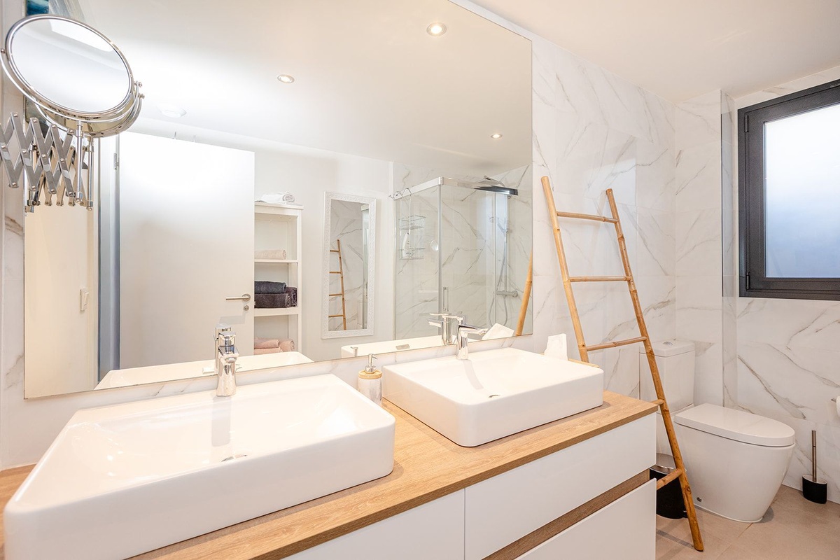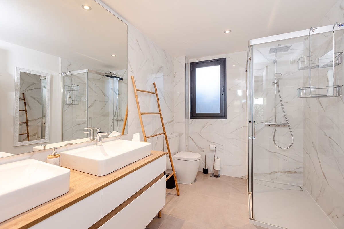 There are three generously sized bedrooms, including a master bedroom with en-suite bathroom, all offering built-in wardrobes and plenty of natural light. The additional bathrooms are finished with contemporary materials and clean, elegant lines.
