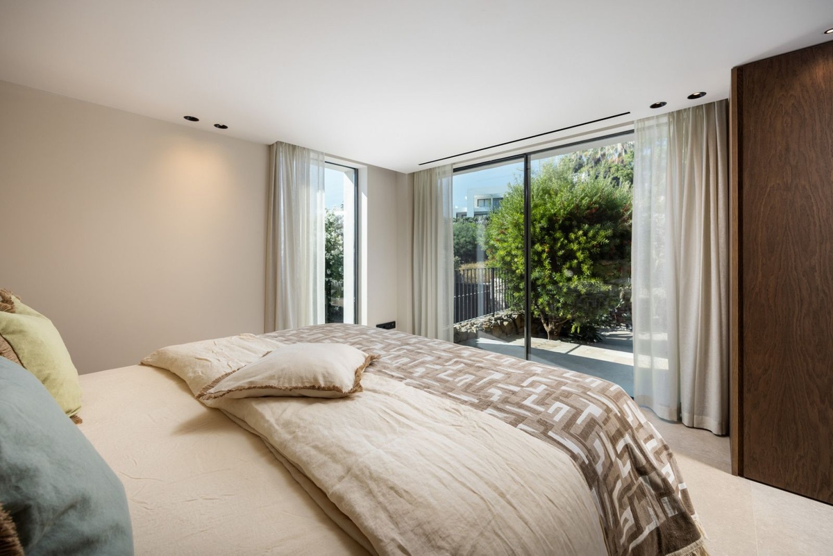 The sloping ceilings and large windows flood the spaces with natural light. The interior design combines clean lines and natural finishes in neutral tones with noble materials, creating an atmosphere of serene elegance. The architectural layout favours a perfect integration between the interior and exterior spaces. Upon entering the property, you will find spacious, bright, and welcoming living areas with high ceilings, which share the limelight with the fully equipped kitchen.