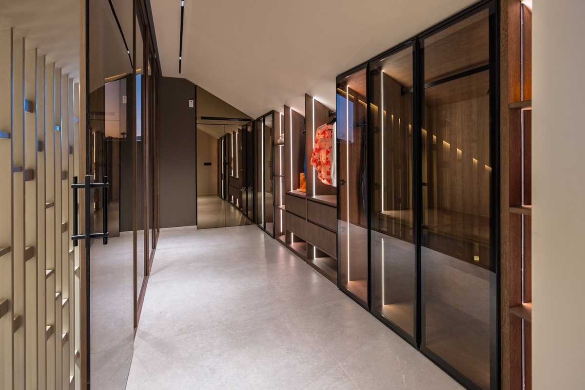 The villa features five carefully decorated bedrooms and six modern bathrooms, five of which are en suite. On the upper floor, the impressive master suite is a private retreat with a spacious wooden walk-in closet, glass doors, and windows that offer open views of the golf valley.