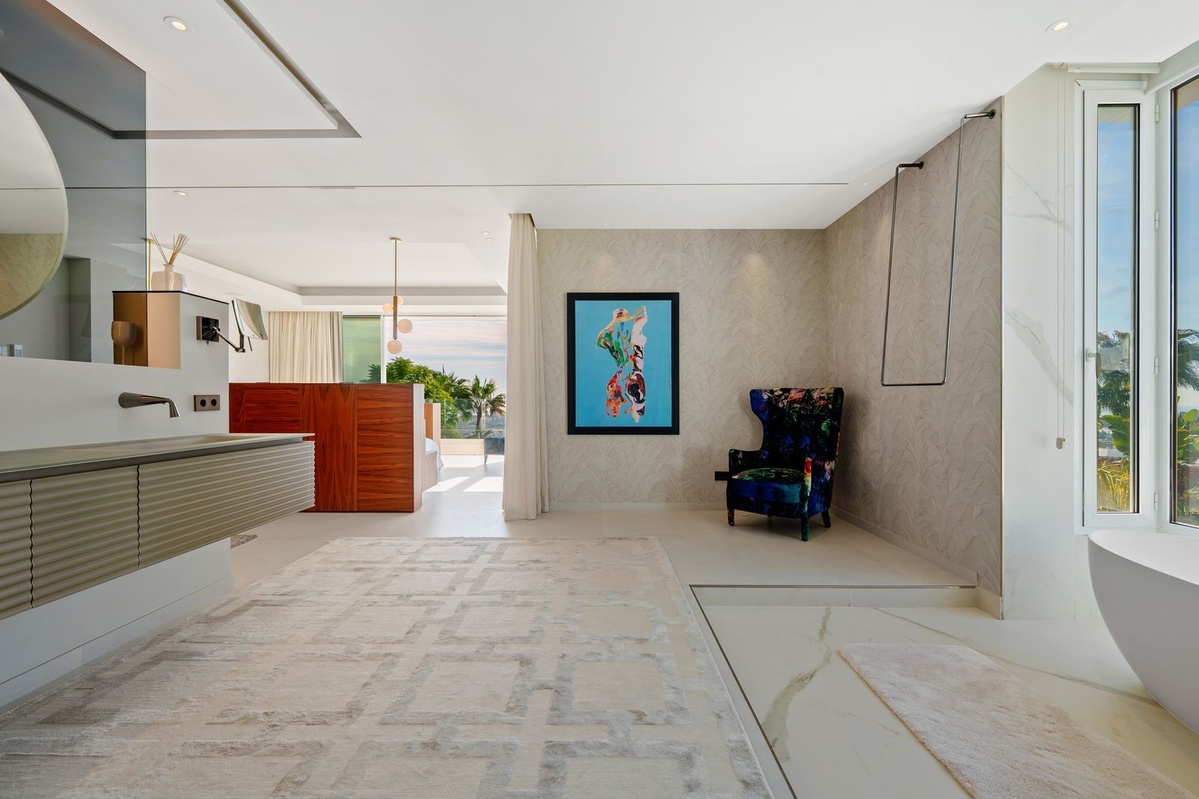 Dit indrukwekkende pand staat bekend als Casa K en geniet een bevoorrechte, verhoogde ligging die de hele dag zonlicht, openheid en verreikende uitzichten maximaliseert. De villa is ontworpen in een verfijnde, eigentijdse mediterrane stijl en combineert royale binnenproporties met uitgebreide beglazing, waardoor een lichte en luchtige sfeer ontstaat waar het binnen- en buitenleven naadloos op elkaar aansluiten. Grote ramen en terrasdeuren omlijsten het landschap prachtig en brengen de zee en de bergen op de achtergrond in het dagelijks leven.