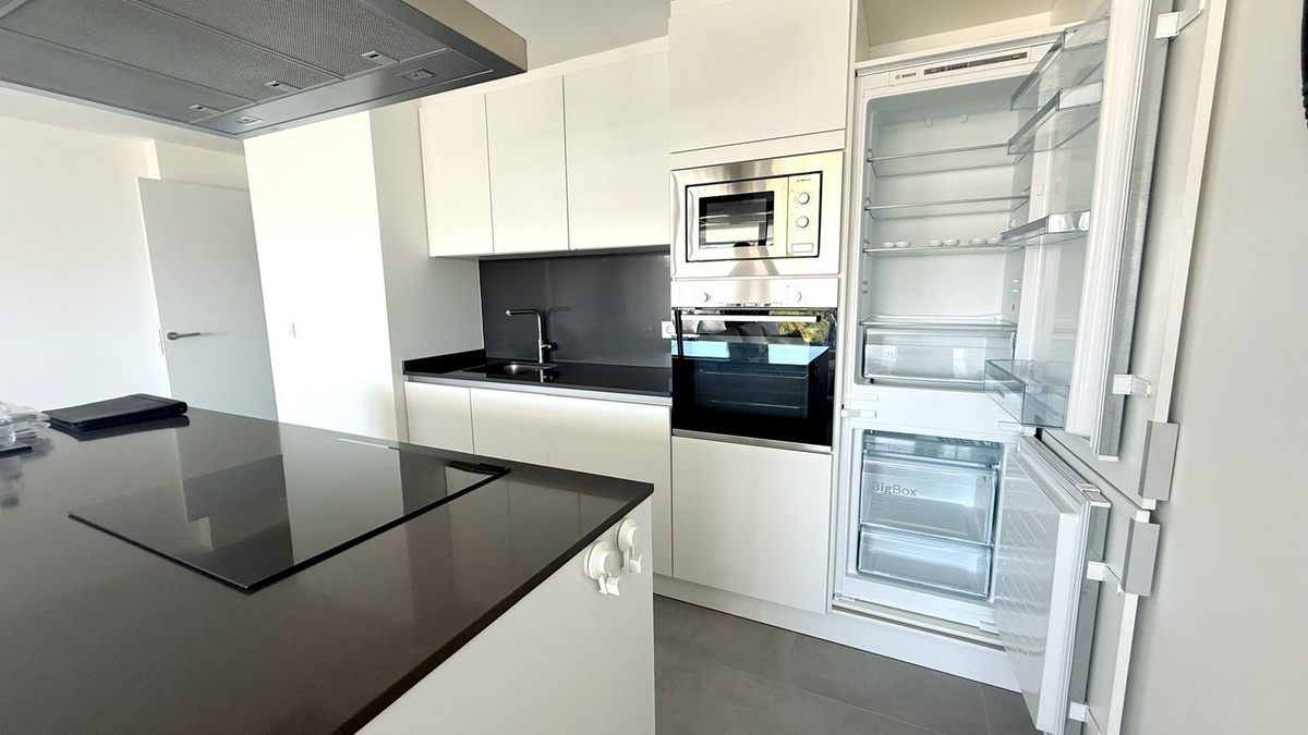 The bright living room blends seamlessly with a modern open-plan kitchen, creating a welcoming and stylish space for everyday living. Large glass doors open onto a private terrace with beautiful sea views, perfect for relaxing and enjoying the surroundings.