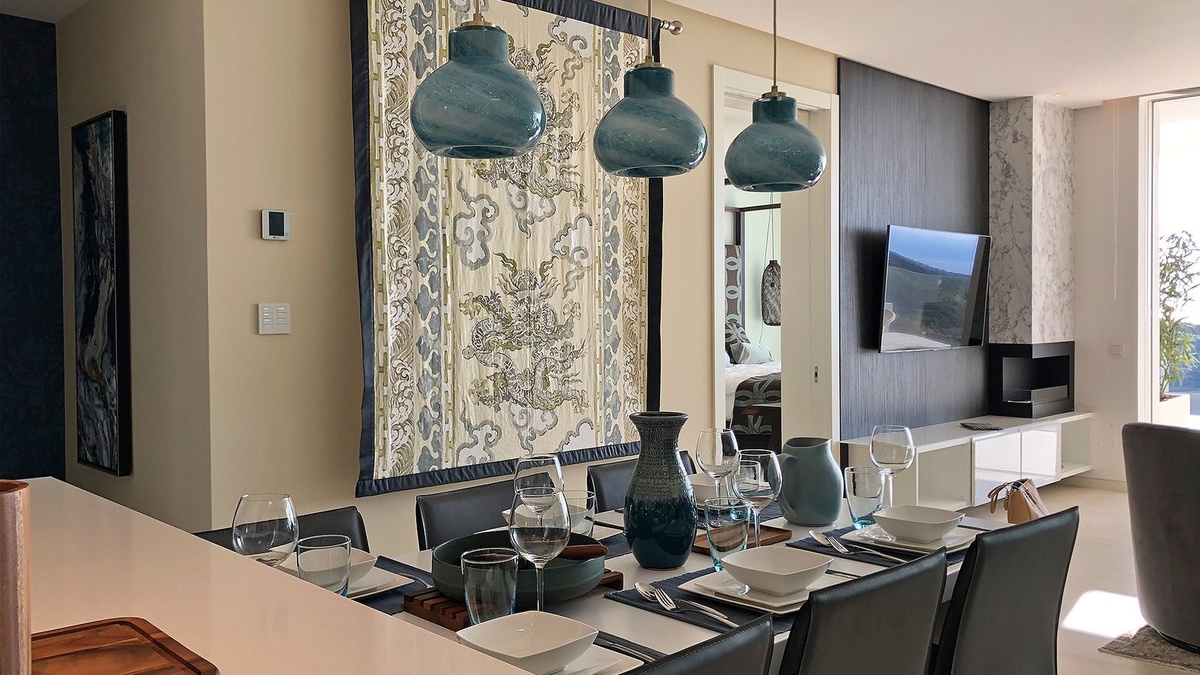 The open-plan living and dining area maximizes natural light and space, with sliding doors that seamlessly blend the indoor and outdoor areas. Highlights include a waterfall-style dining table, a plush custom-made sofa, an ethanol fireplace, and a wall-mounted LED TV.