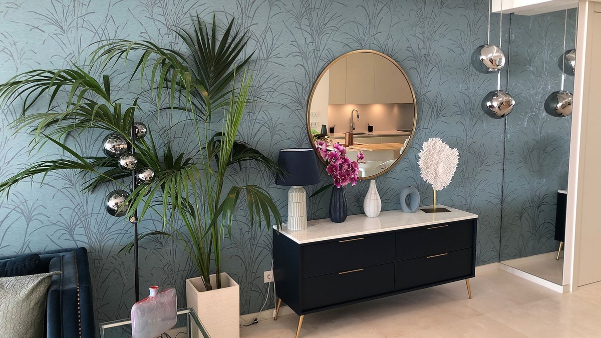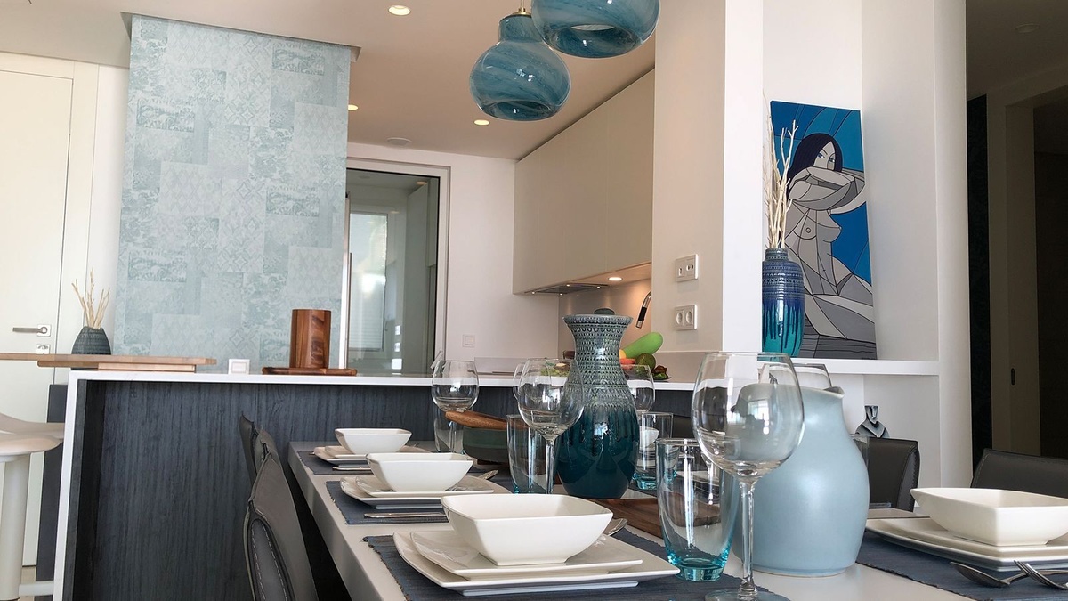Inside, the apartment features two spacious bedrooms, two luxurious bathrooms, and designer furnishings by Roia Jabari Interior Design. The custom-made furniture, high-end fabrics, and carefully curated art pieces create an elegant atmosphere throughout the space.