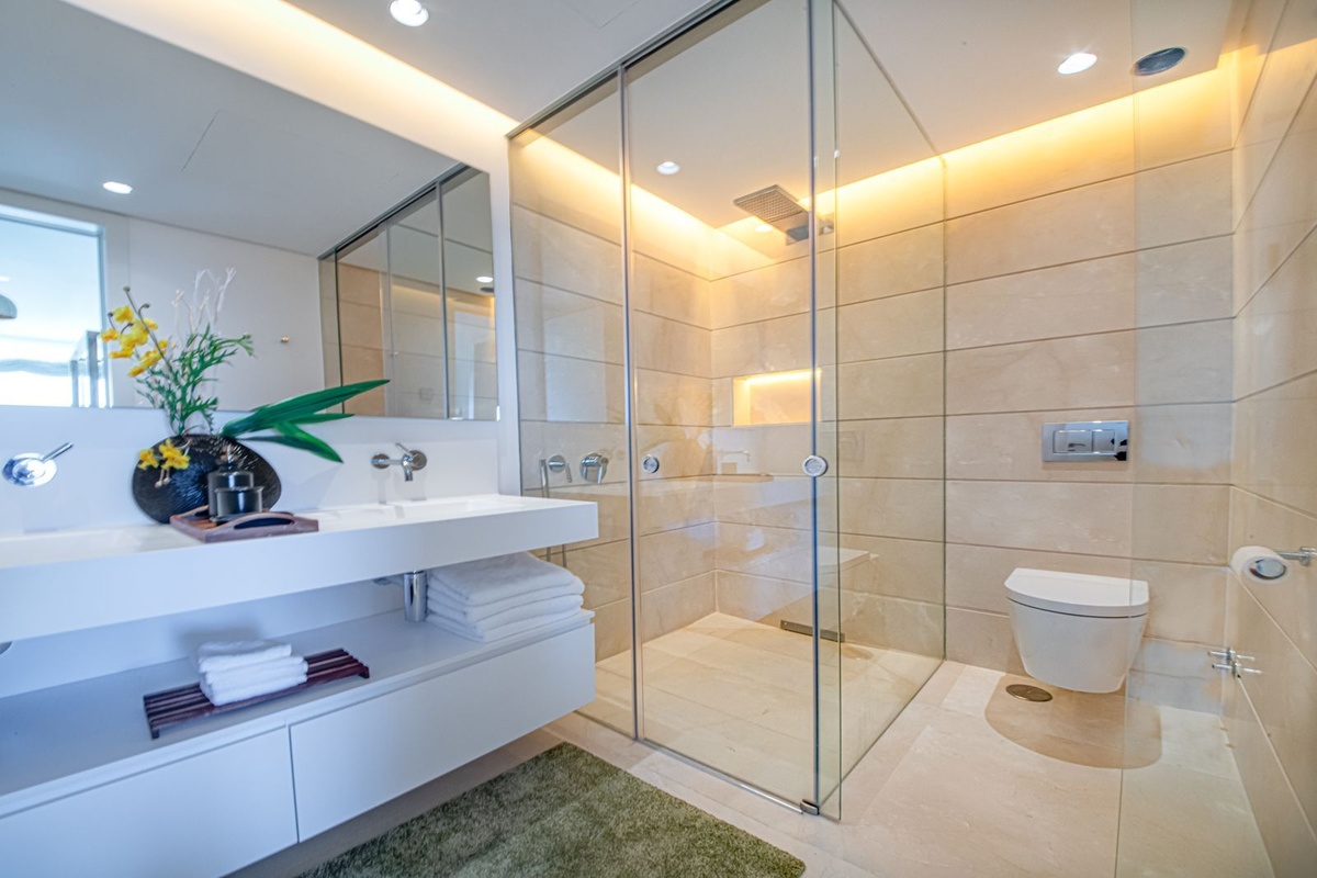 The master bedroom is flooded with natural light, thanks to floor-to-ceiling glass doors that open to stunning views, while the second bedroom also offers expansive windows. Both bathrooms are finished with luxury Gunni & Trentino designs, featuring double vanities, walk-in glass showers, and high-end fixtures.