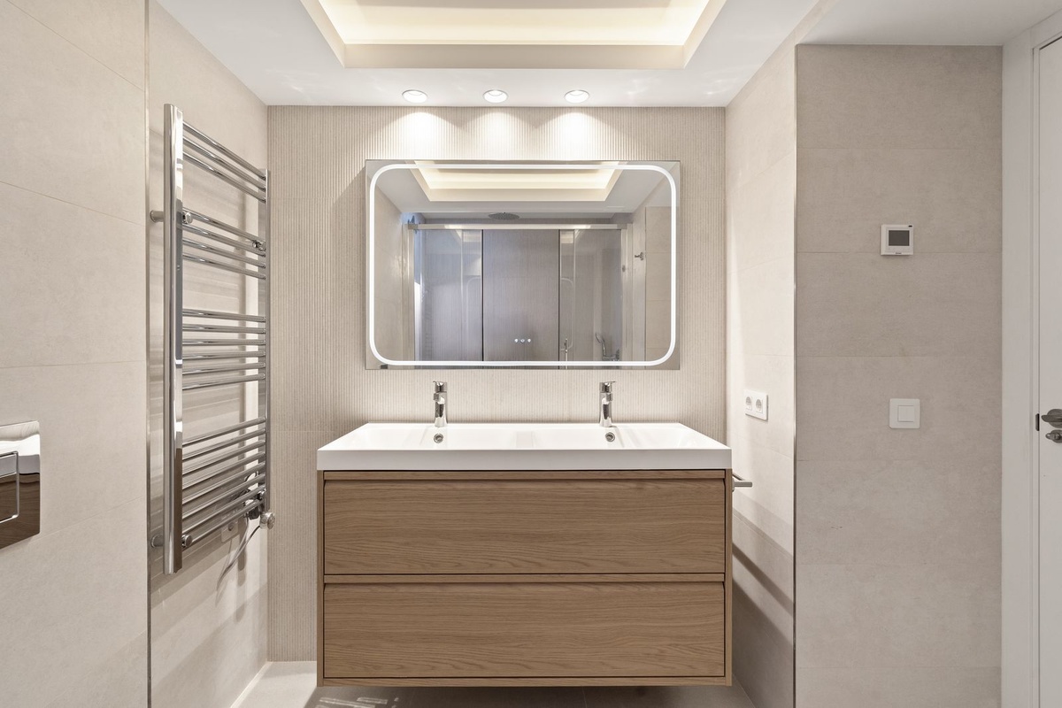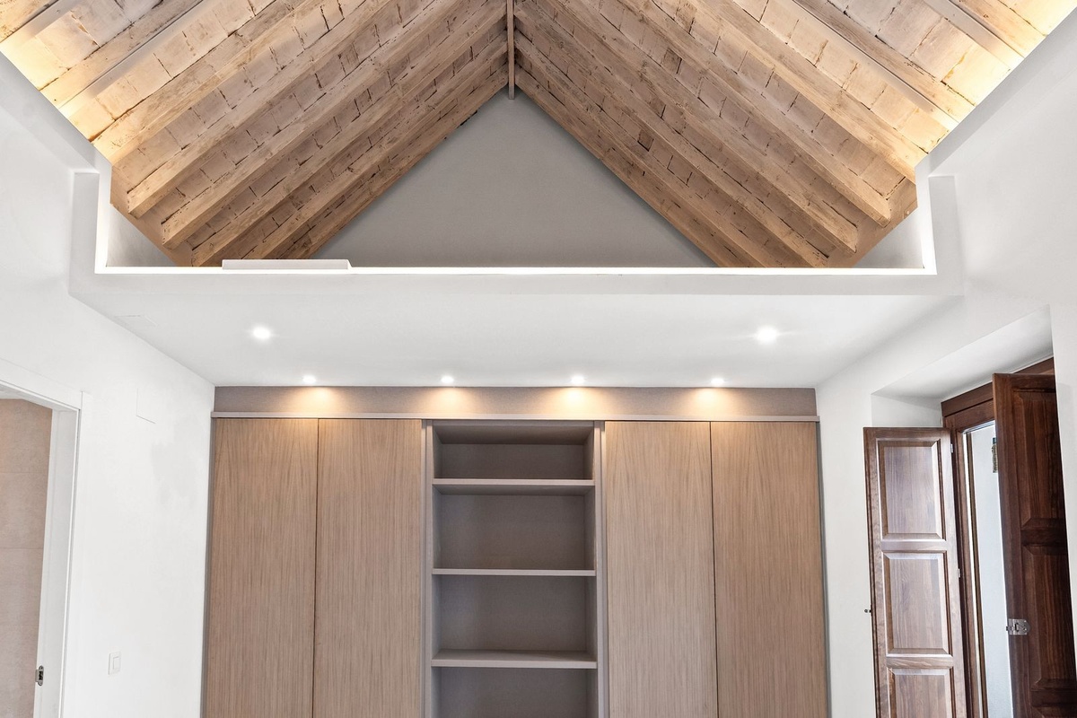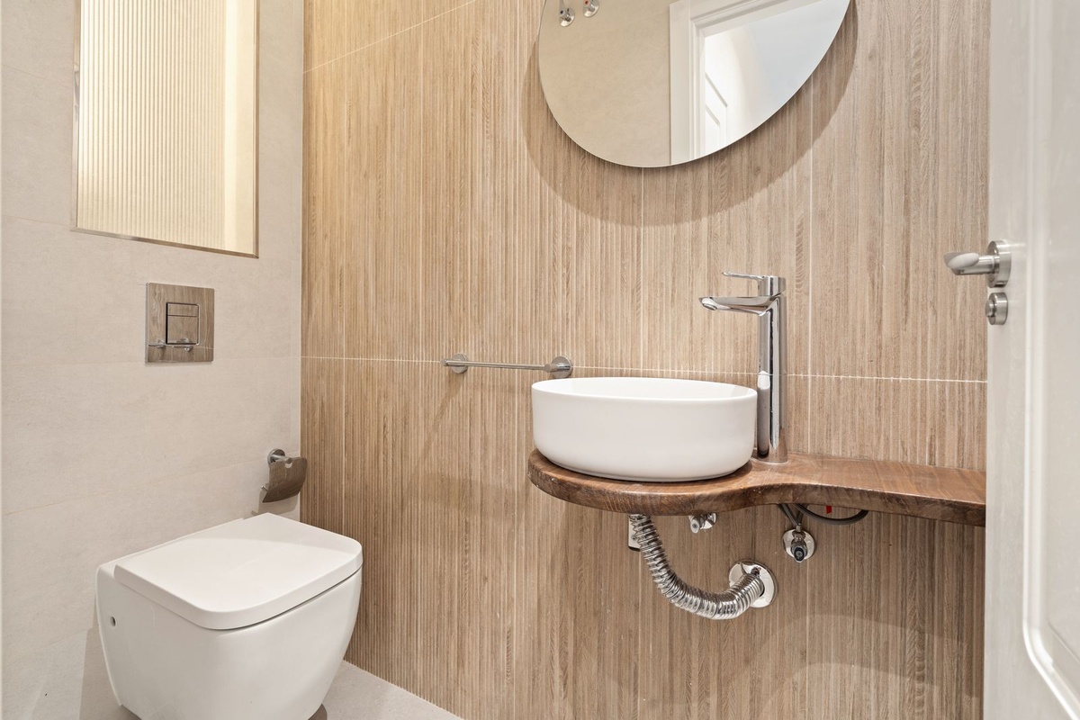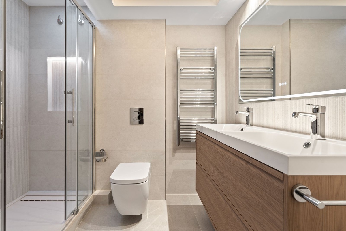 Bathrooms have been resolved with a contemporary and restrained approach, incorporating walk-in showers, refined fittings, and neutral textures. Storage solutions are integrated throughout the property, maintaining visual clarity while offering practical capacity.