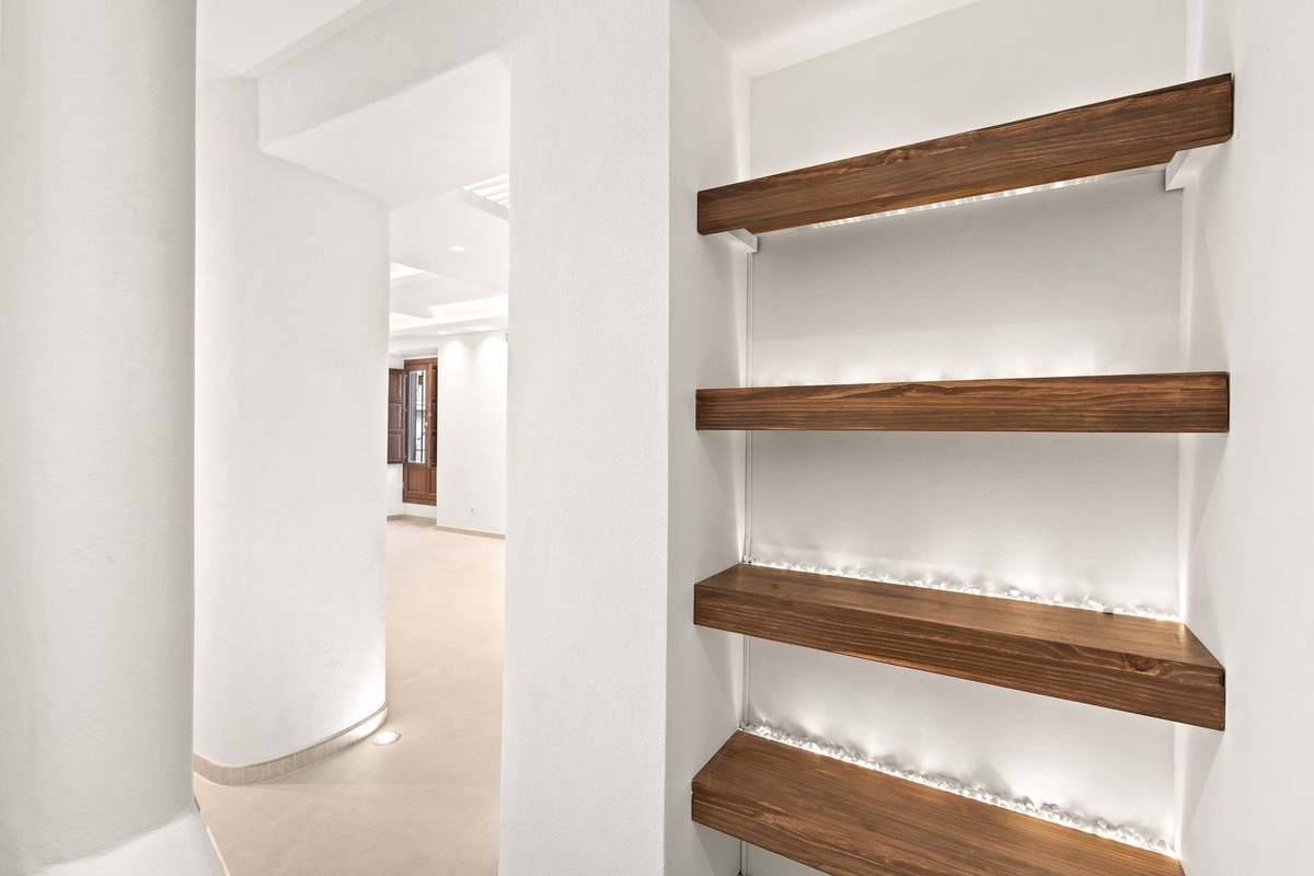 The entrance leads into a calm and well-defined interior where neutral tones and clean lines create a sense of continuity. Flooring, lighting, and carpentry have been carefully selected to enhance proportion and flow, resulting in spaces that feel both practical and understated. Natural wood details introduce warmth and contrast, reinforcing the connection between different levels of the home.