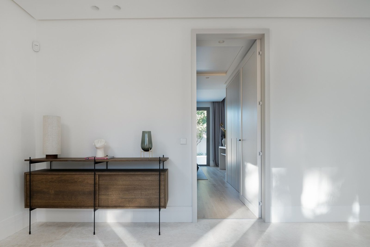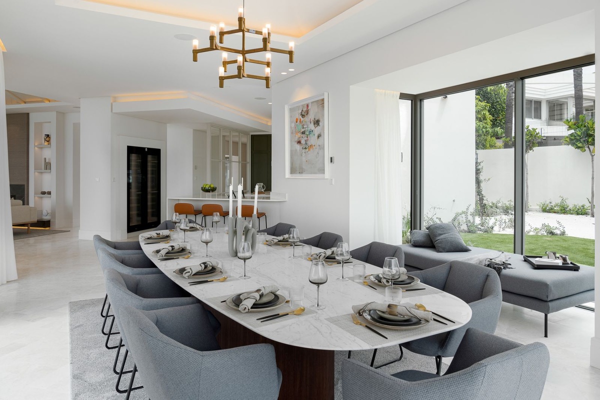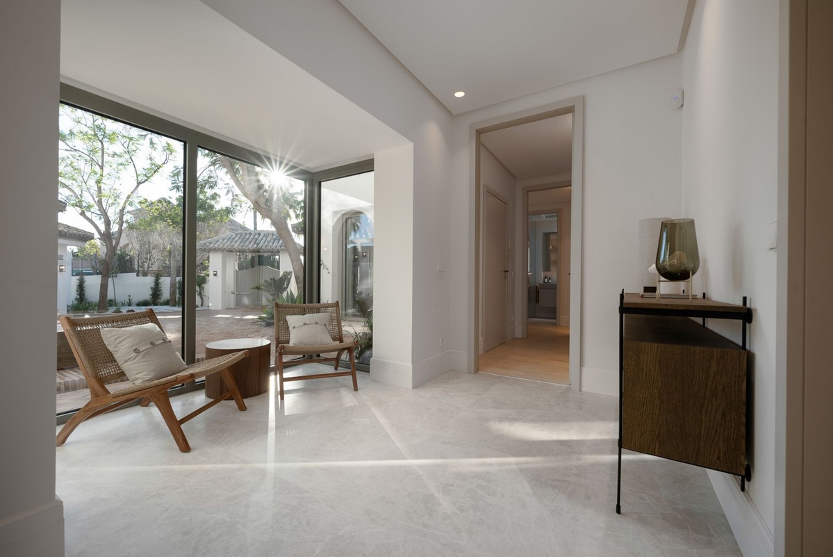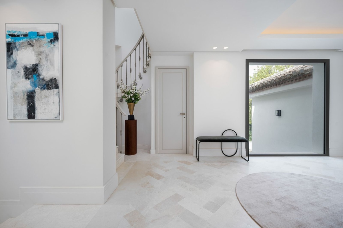 Upon arrival, a private driveway leads to a charming Andalusian-style courtyard. This traditional feature contrasts beautifully with the villa’s modern design, providing a warm, welcoming first impression. Once inside, the double-height entrance hall features natural light flooding through large windows, with polished marble flooring setting the tone for the rest of the home.