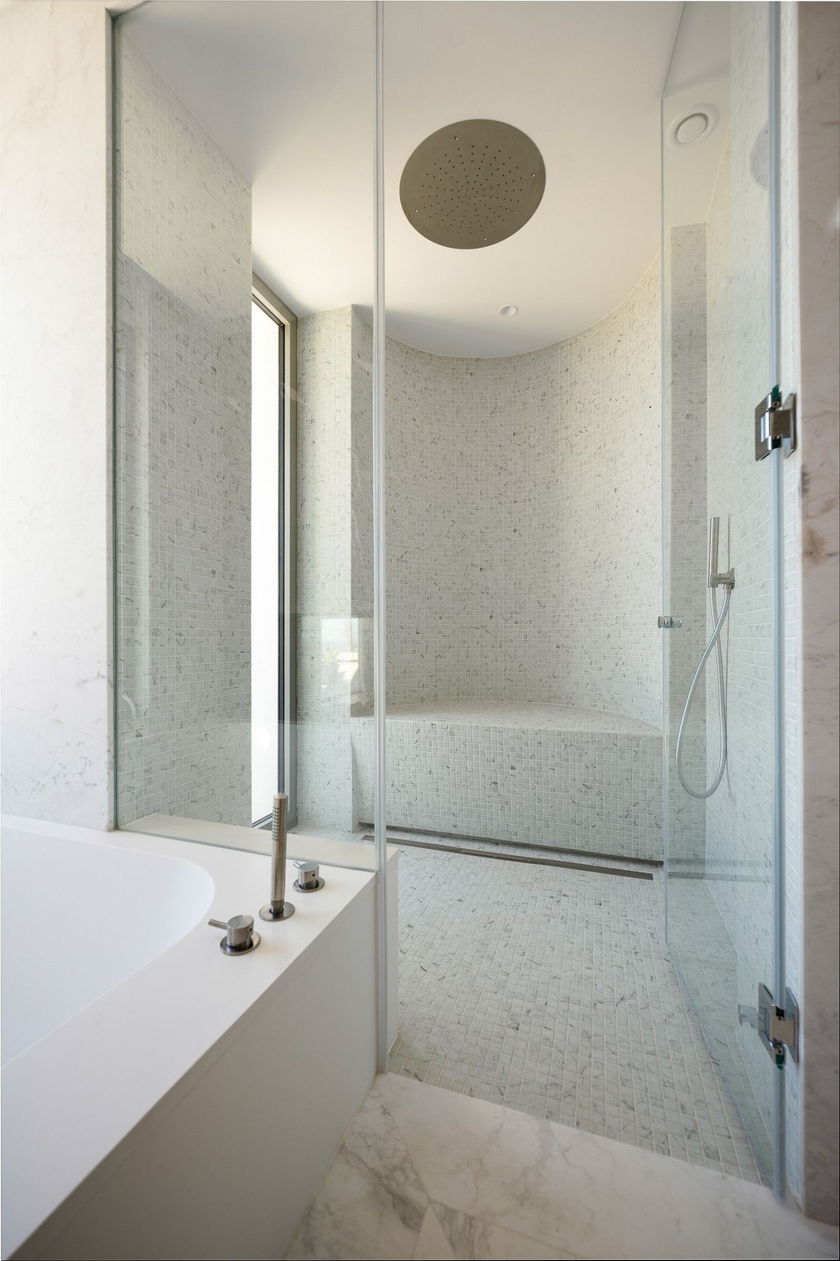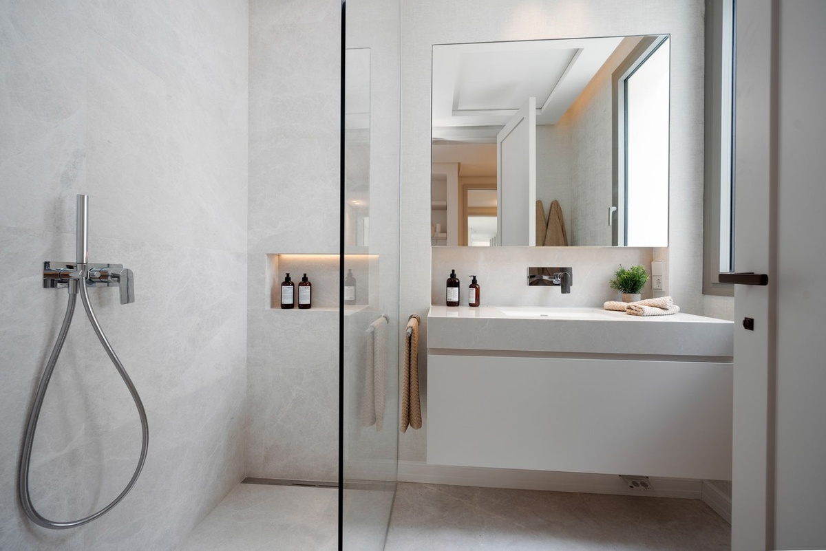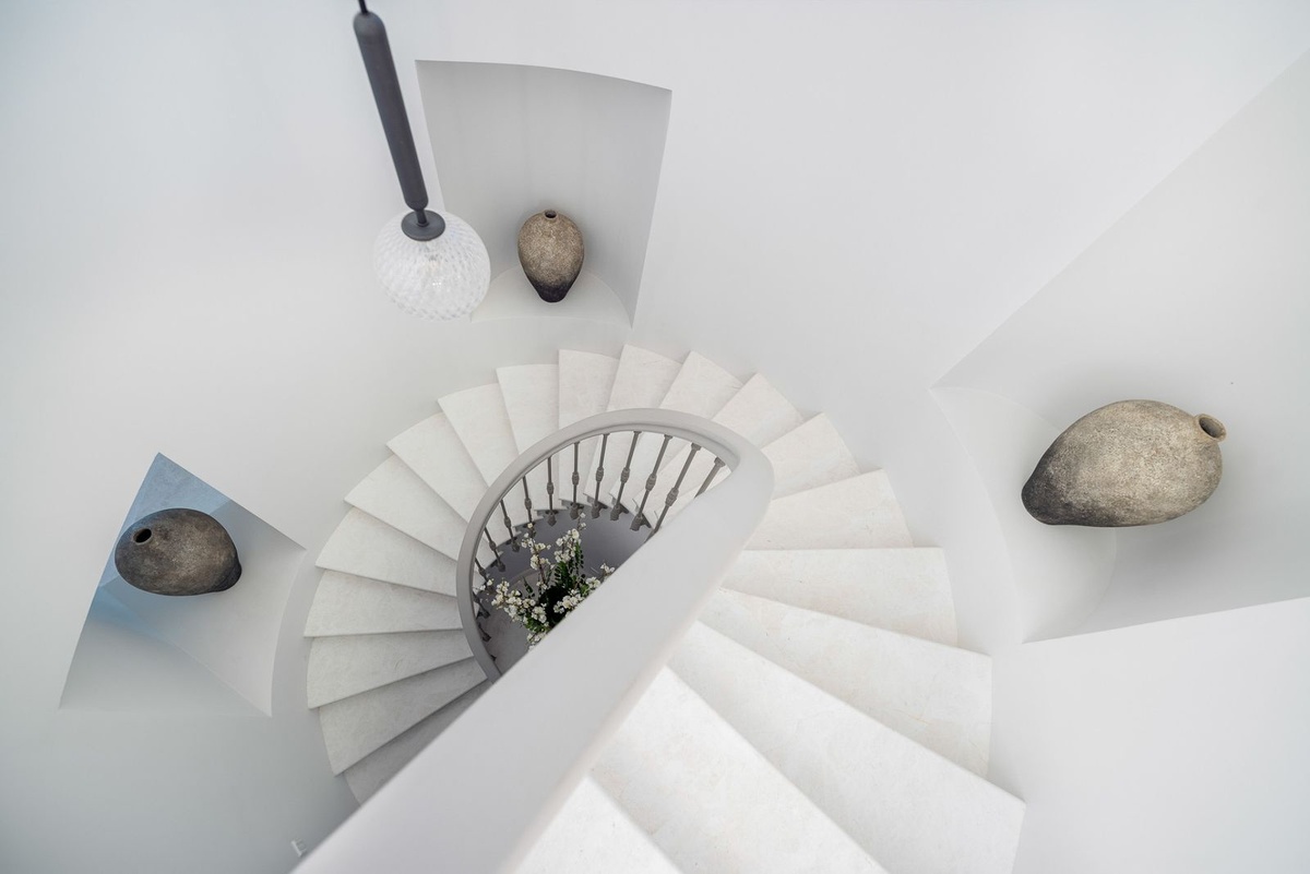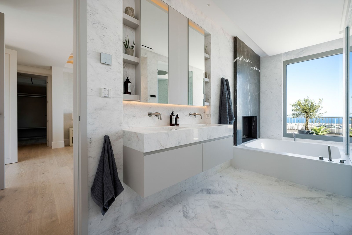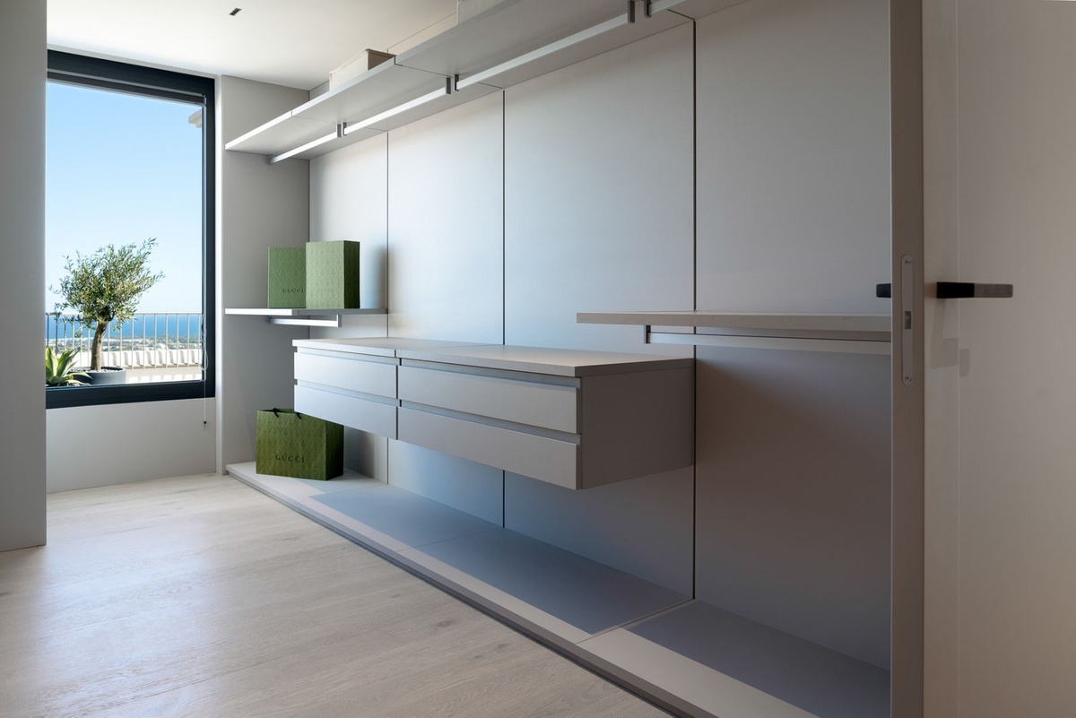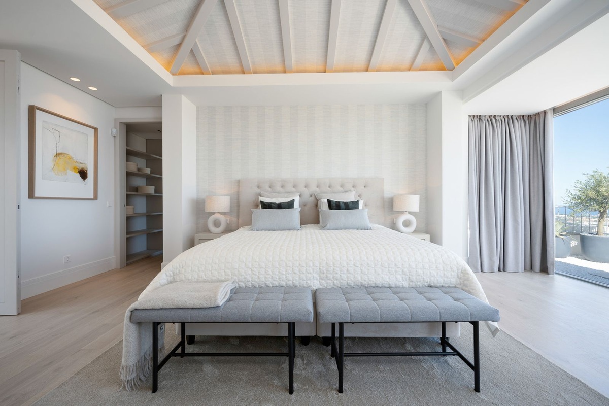 A central spiral staircase leads to the upper floor, where the home’s most spectacular vistas come into view. The master suite sits in an elevated position, maximizing privacy and ocean visibility. It includes a generous sleeping area, a private office with panoramic coastal views, a large en-suite bathroom with a freestanding tub, a hammam-style walk-in shower, and a fully fitted walk-in closet. Three additional bedrooms with en-suite bathrooms and integrated wardrobes are also located on this level.