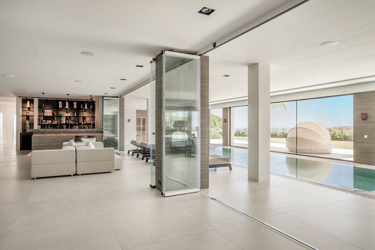 Вступая в гостиную, вы сразу же поражены величием пространства. Потолки, достигающие впечатляющей высоты 8-10 метров, создают ощущение открытости и летучести. Природный свет заливает комнату от огромных окон, которые простираются от пола до потолка, демонстрируя захватывающие дух панорамные виды на море и окружающий пейзаж. Гостиная плавно интегрируется с террасным пространством, стирая границы между внутренним и наружным проживанием.