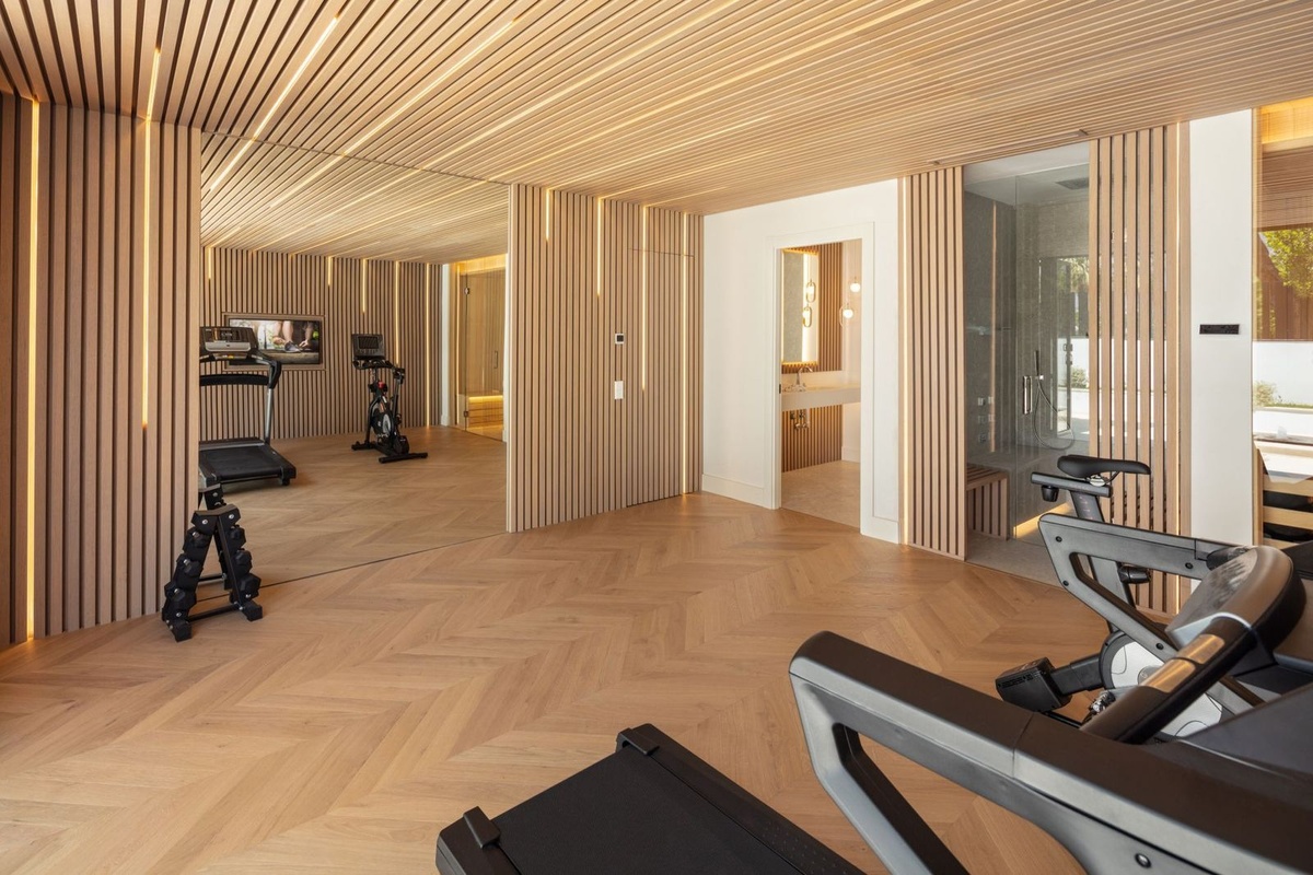 The villa also enjoys a chic gym area, accompanied by a bathroom, steam bath and sauna.