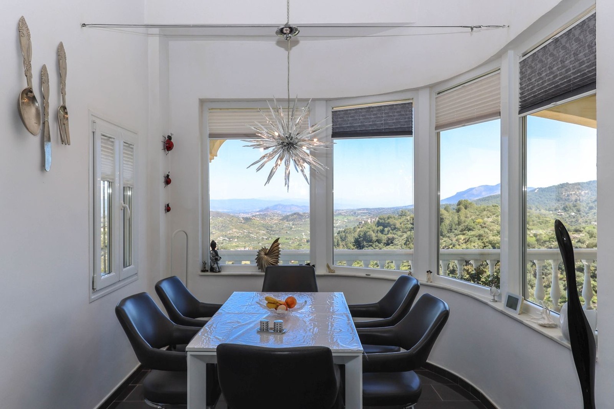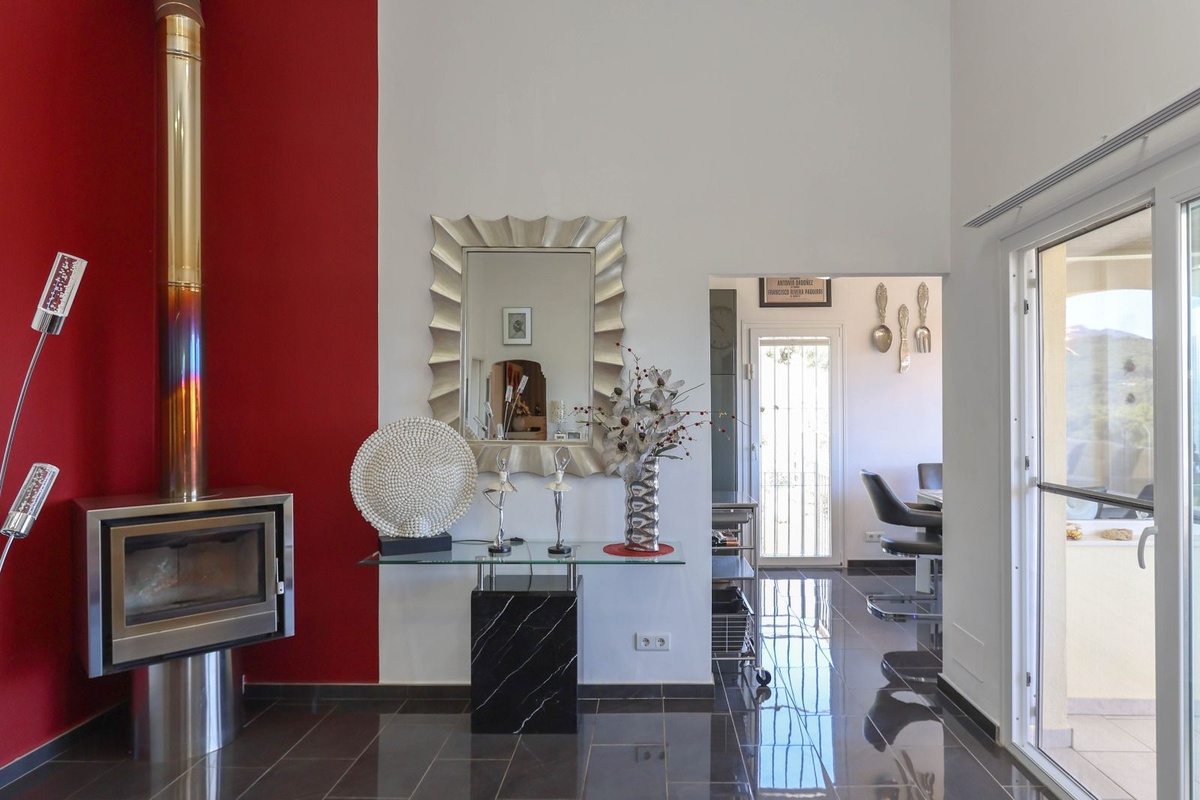 The house is built on two levels. The main accommodation is located on the the top level with the separate apartment sitting below. A staircase leads upto the front door with access to the rear shady terrace. Entering into the Villa you are immediatley impressed by the quality of the finish. To the right is the guest bathroom and to the left Bedrooms 3. Walking from the hallway into the bright lounge with high ceilings and two sets of patio doors the room feels light, airy and welcoming. A wood burning stove is located in the corner to provide winter heat. Both set of patio doors lead to the large covered terrace which sits to the front of the property, this is the most wonderful spot to sit and relax and enjoy the beautiful views.